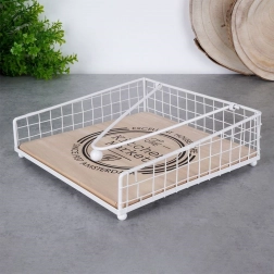 Ten biały metalowy serwetnik z drewnianym detalem został zaprojektowany do wygodnego dozowania serwetek i ich pewnego zabezpieczenia dzięki ramieniu dociskowemu. Sprawdzi się w kuchni, jadalni oraz podczas posiłków na zewnątrz – w ogrodzie, na tarasie lub balkonie.