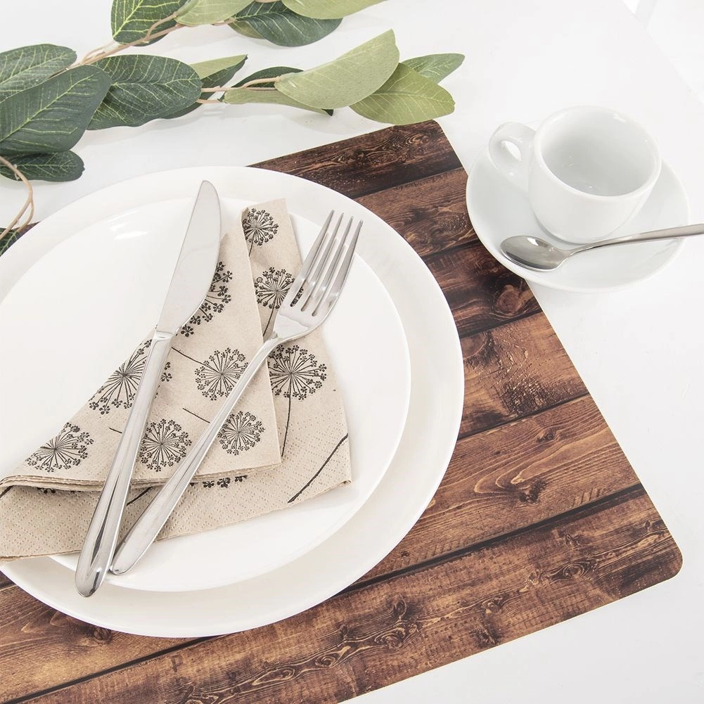 Podkładka na stół z realistycznym dekorem drewna to praktyczny i dekoracyjny dodatek do kuchni lub jadalni. Dzięki wymiarom 43 × 30 cm idealnie mieści się pod talerzem, chroni blat stołu przed plamami i zarysowaniami, a także podkreśla Twoją zastawę stołową.