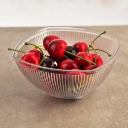 Stylowa miska do serwowania o kwadratowym, zaokrąglonym kształcie i pionowym żłobkowaniu doskonale prezentuje się na stole w domu i w ogrodzie. Przezroczysty akryl podkreśla kolory podawanych potraw, a dzięki teksturze miska pewnie leży w dłoni.