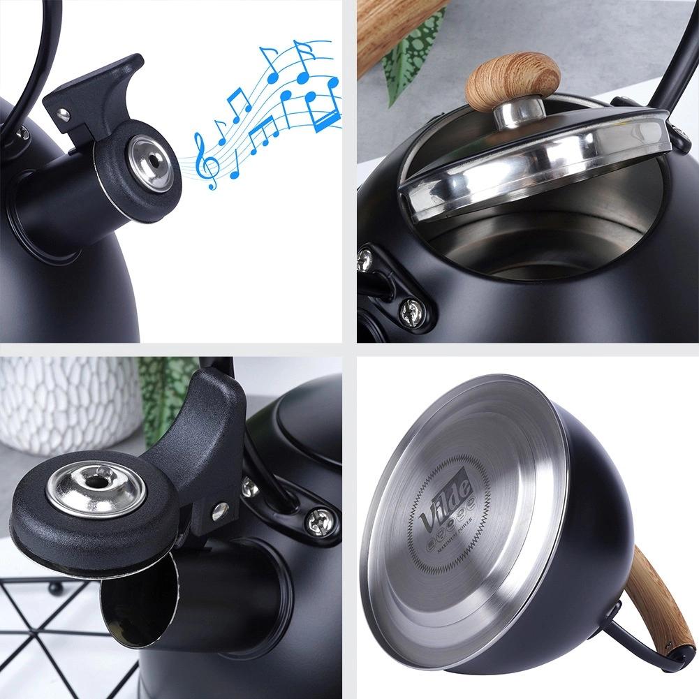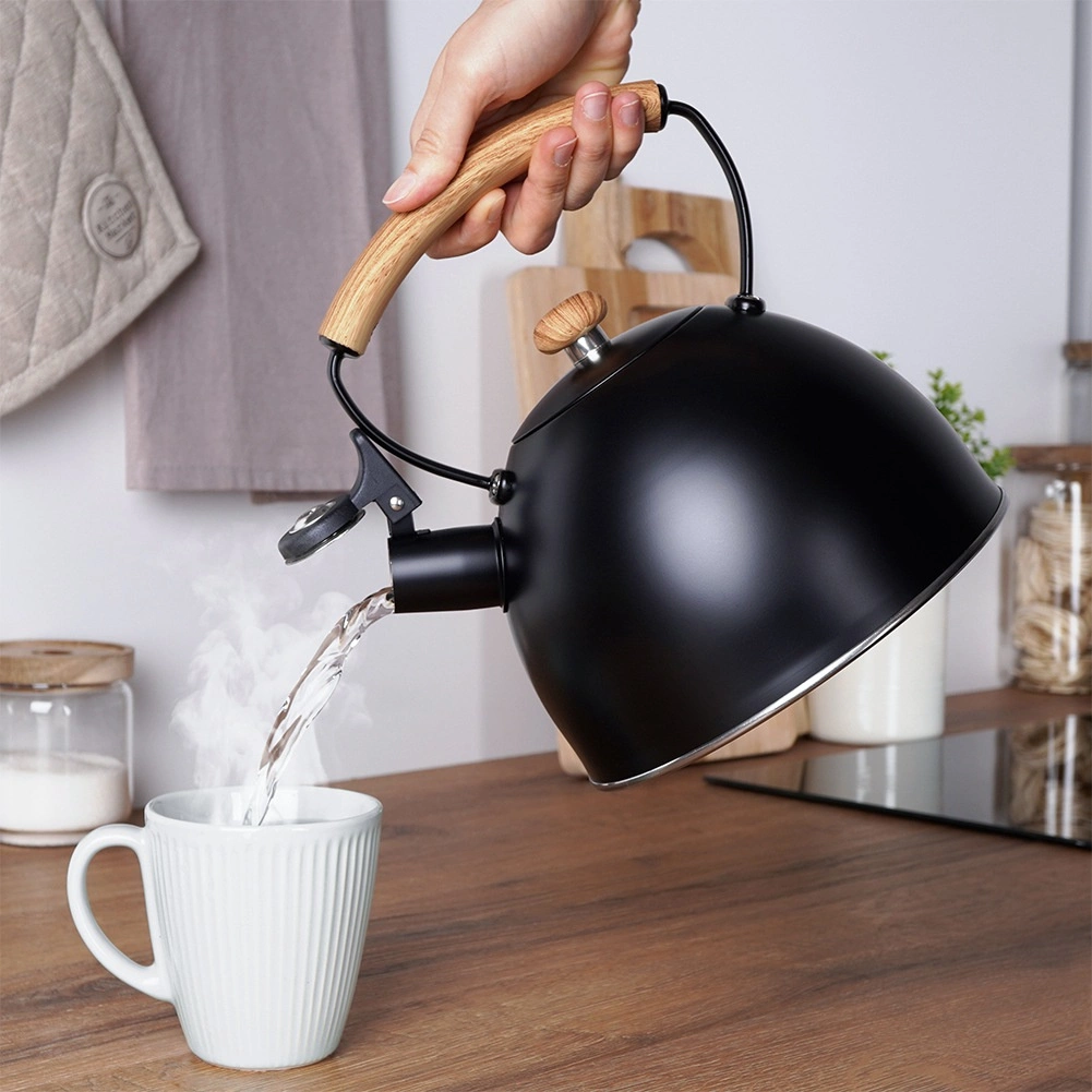 Ten stylowy czajnik ze stali nierdzewnej jest idealny do codziennego przygotowywania kawy, herbaty i naparów ziołowych. Matowa czarna powierzchnia z dekorem drewna na uchwycie doskonale pasuje do nowoczesnych i klasycznych kuchni. Dzięki przemyślanej konstrukcji z dnem akutermicznym woda nagrzewa się szybko nawet przy niższej mocy, co oszczędza czas i energię.