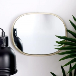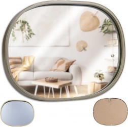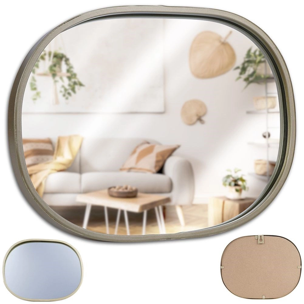 Stylowe lustro ścienne o owalnej sylwetce w eleganckim, szampańsko złotym wykończeniu to ponadczasowy dodatek do salonu, przedpokoju i sypialni. Metalowa rama podkreśla jego design i chroni powierzchnię zwierciadła podczas codziennego użytkowania.
