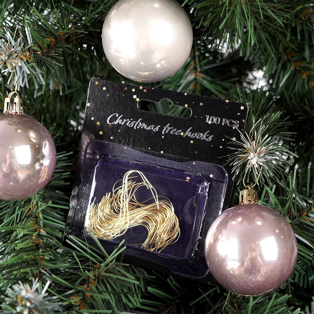 Praktyczny zestaw 100 metalowych haczyków w złotym kolorze do łatwego i bezpiecznego zawieszania ozdób choinkowych. Dzięki długości 4 cm doskonale pasują do różnych typów i rozmiarów dekoracji, są wytrzymałe, wielokrotnego użytku i mają ergonomiczny kształt umożliwiający szybkie mocowanie bez wysiłku – także dla dzieci.