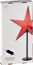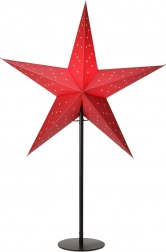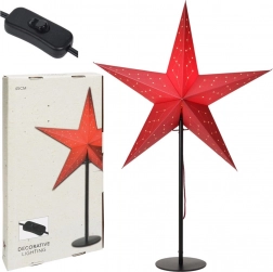 Stylowa lampka stołowa w kształcie świątecznej gwiazdy w wykonaniu 3D doda wnętrzu świątecznej atmosfery i przytulnego światła. Solidna gwiazda z mocnej tektury w czerwonym kolorze na metalowej czarnej podstawie ma wysokość 70 cm, a średnica gwiazdy wynosi 45 cm. Posiada zasilanie sieciowe, przewód 1,9 m oraz włącznik. Odpowiednia do żarówki E14 (brak w zestawie).