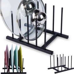 Uporządkuj swoją kuchnię i miej pokrywki oraz talerze zawsze pod ręką. Metalowy stojak z solidną prostokątną podstawą utrzymuje naczynia w pionowej pozycji, oszczędza miejsce i zapewnia swobodny przepływ powietrza dla łatwego suszenia. Minimalistyczny czarny design pasuje do nowoczesnych i klasycznych wnętrz.