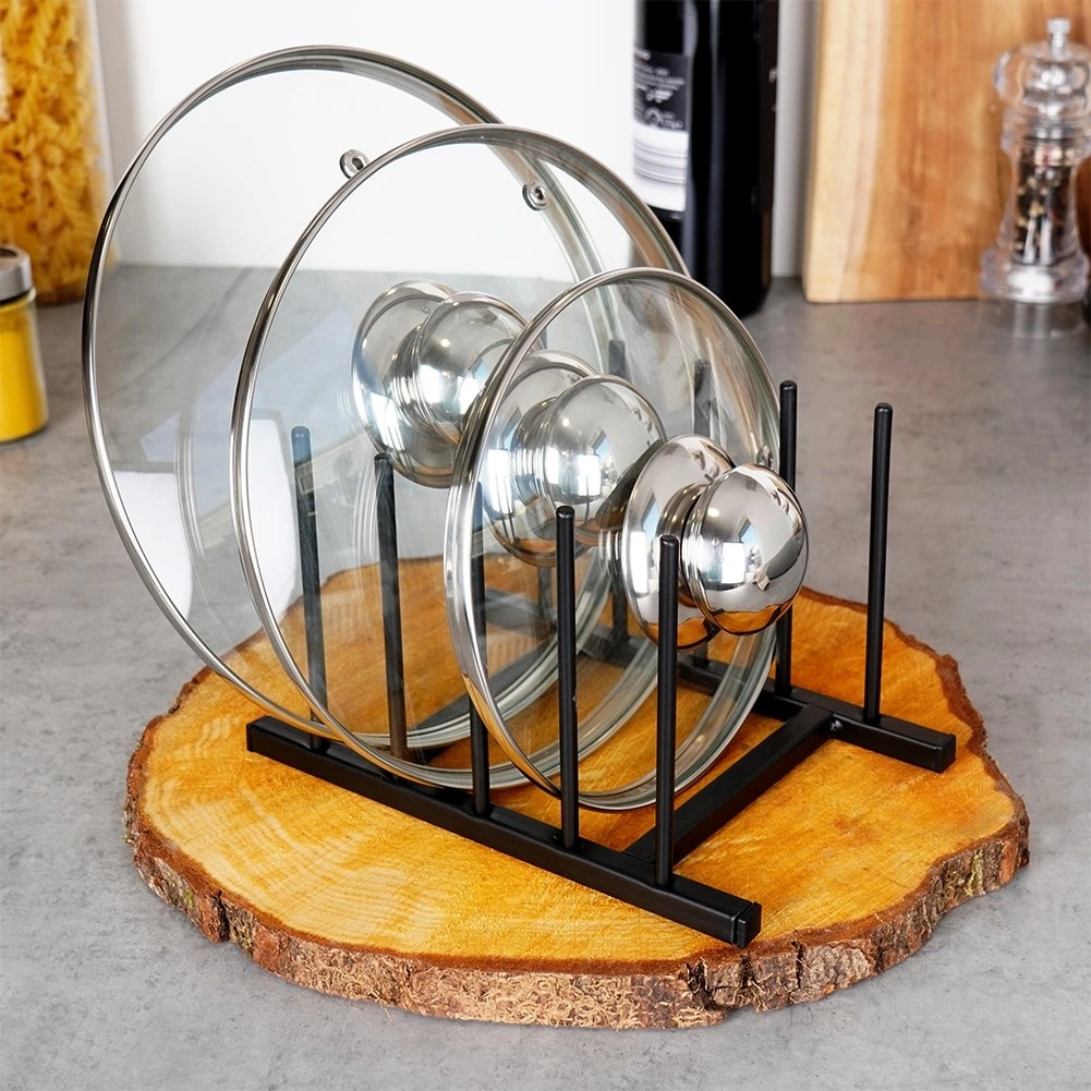 Wiele przegródek pionowo oddziela pokrywki i talerze, dzięki czemu się nie przewracają ani nie rysują. Idealny do głębokiej szuflady, szafki oraz na blat.