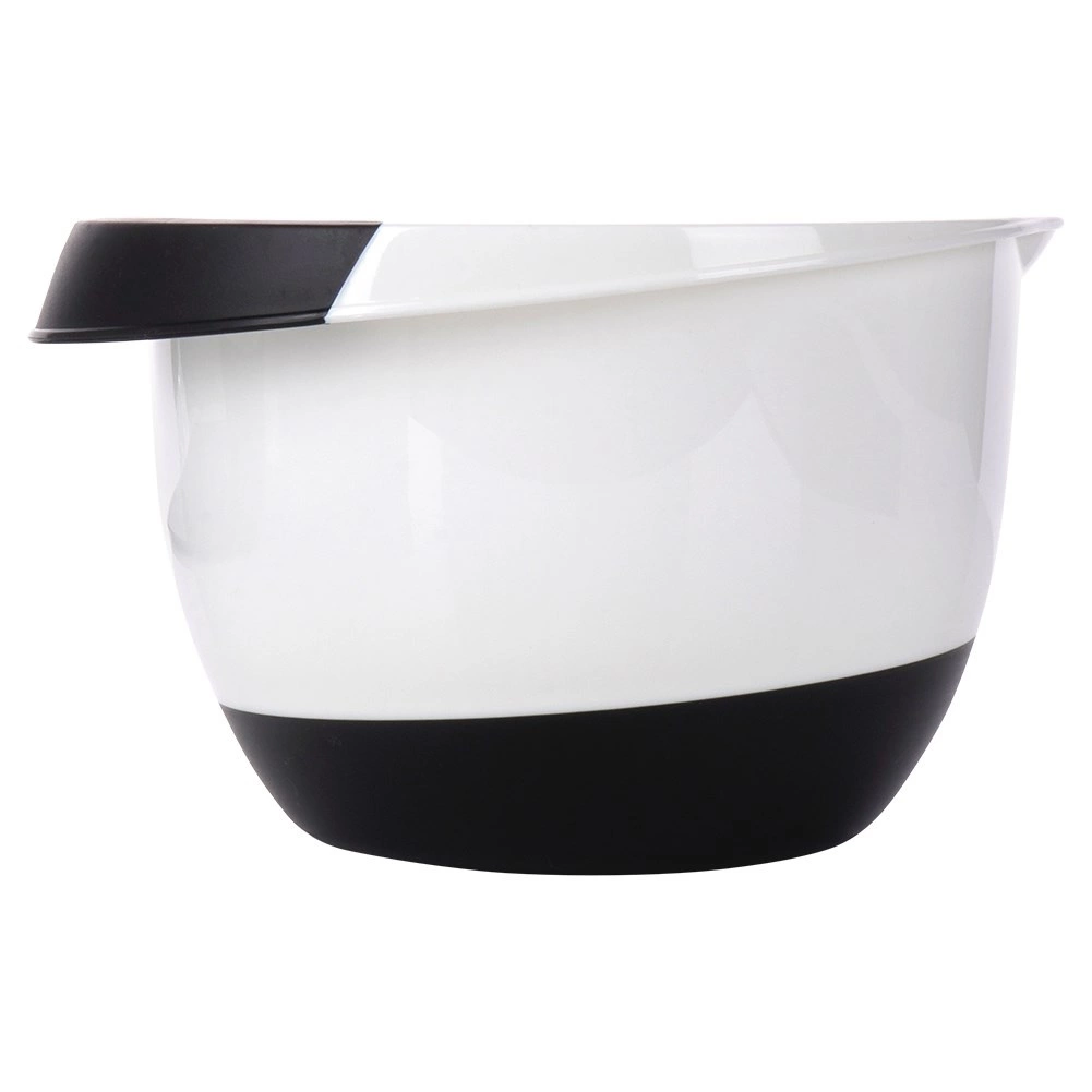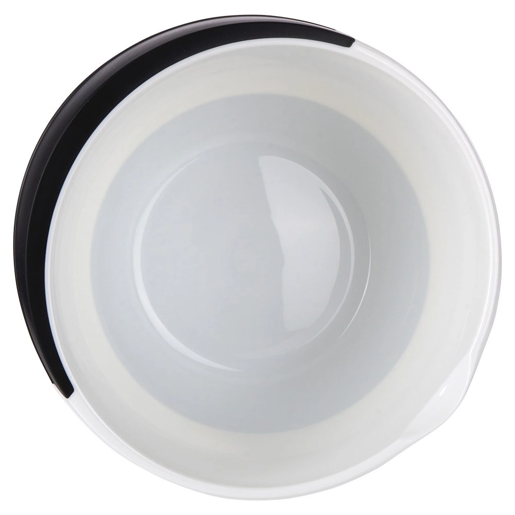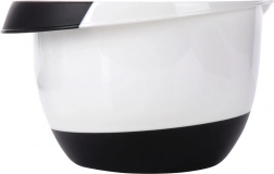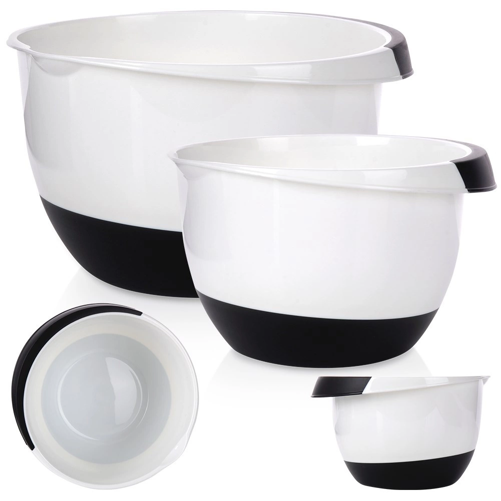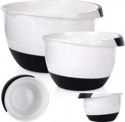 Uniwersalny zestaw kuchennych misek w białym kolorze z czarnymi, antypoślizgowymi dnem dla maksymalnej stabilności na blacie. Dzięki zintegrowanym uchwytom i dzióbkowi nalewanie ciasta czy sosów jest czyste i precyzyjne. Miski są łatwe w utrzymaniu, bardzo lekkie, a jednocześnie wytrzymałe, dlatego sprawdzą się w codziennym gotowaniu i pieczeniu.