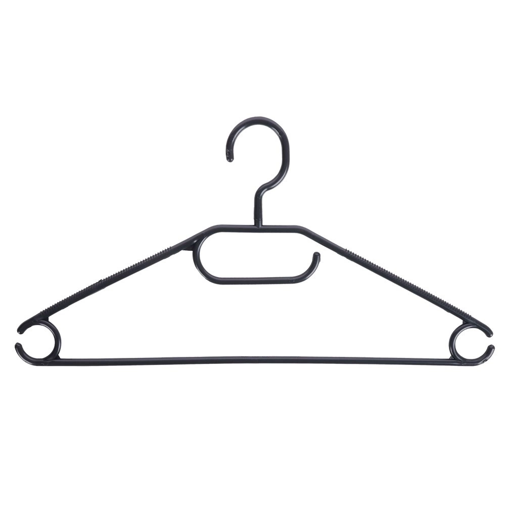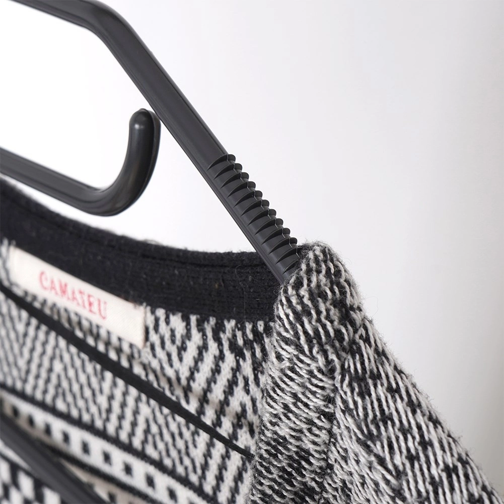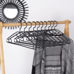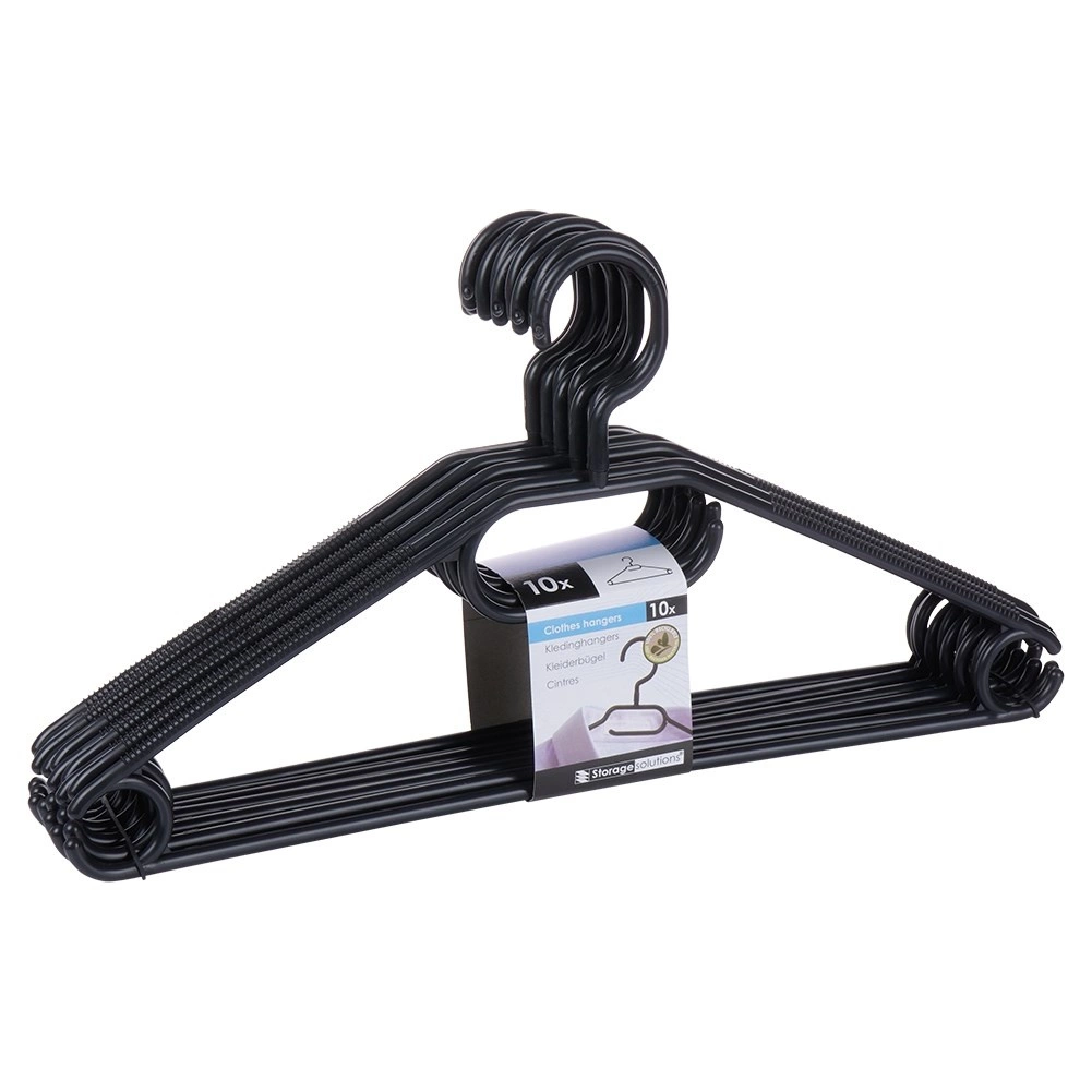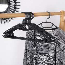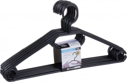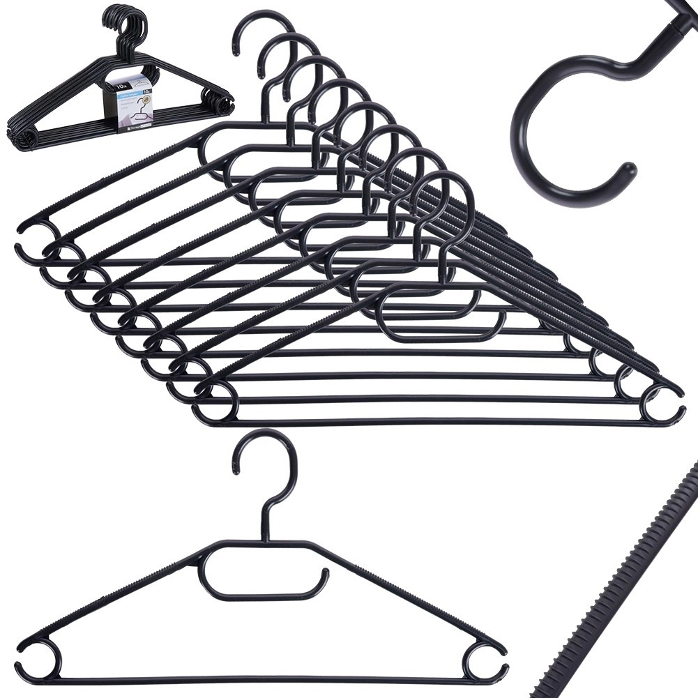 Utrzymaj porządek w garderobie dzięki zestawowi 10 wysokiej jakości wieszaków w eleganckim czarnym kolorze. Dzięki obrotowemu haczykowi łatwo umieścisz je w każdej szafie, a liczne punkty zawieszenia pozwolą odwiesić koszule, marynarki, spódnice, spodnie oraz dodatki, takie jak szale czy krawaty.