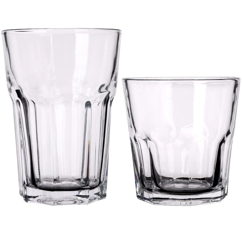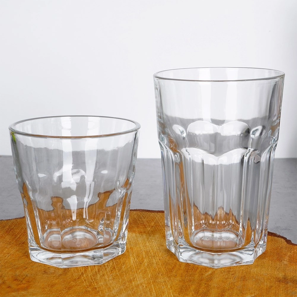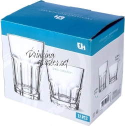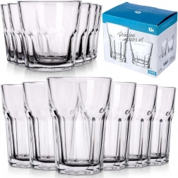 Praktyczny zestaw dwunastu szklanek w dwóch rozmiarach na co dzień. Zawiera 6 mniejszych szklanek 230 ml i 6 większych 330 ml z przezroczystego, wytrzymałego szkła z efektownym fazowanym zdobieniem. Są uniwersalne do wody, soków, lemoniad i drinków, stabilne dzięki grubemu dnu oraz odpowiednie do zmywarki dla łatwej pielęgnacji.