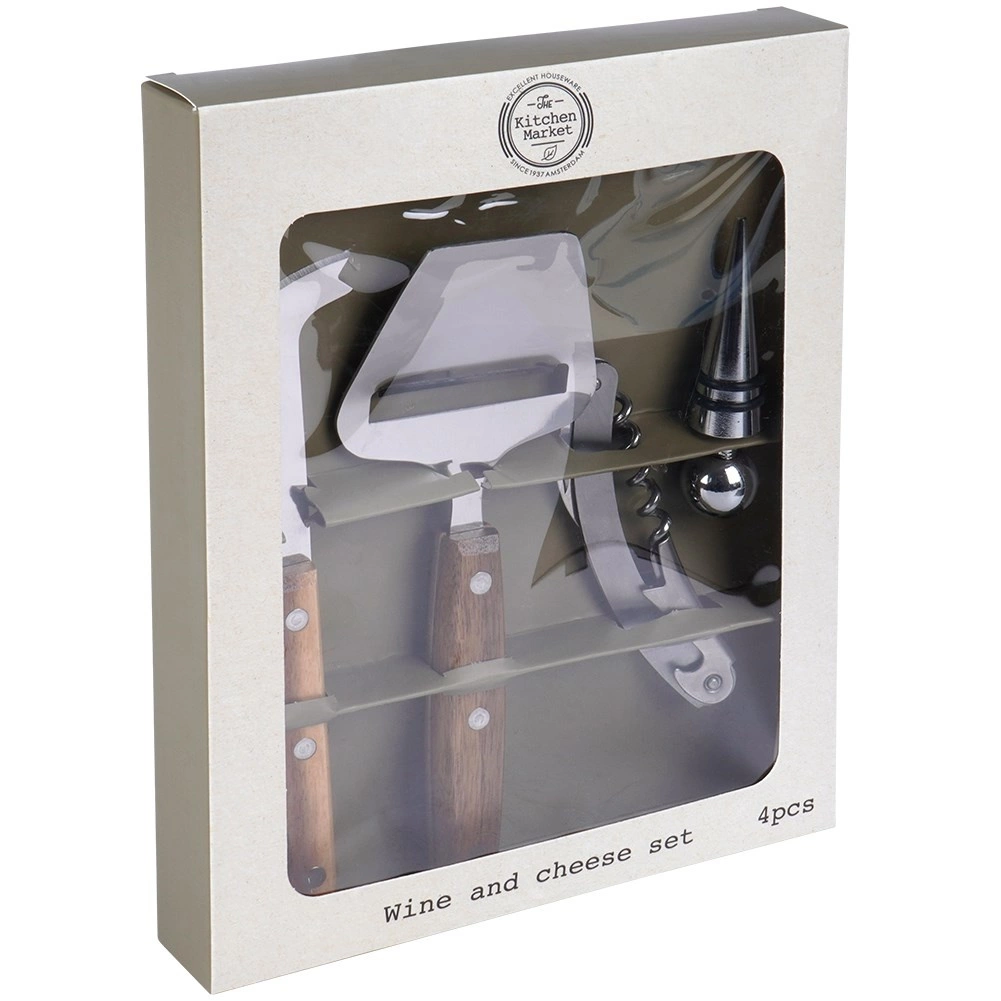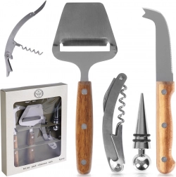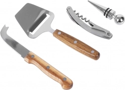 Stylowy zestaw czterech akcesoriów dla miłośników wina i serów – korkociąg, zatyczka do butelki, nóż do sera i krajalnica. Wykonany z wytrzymałej stali nierdzewnej z drewnianymi rękojeściami, idealny do eleganckiego serwowania i wygodnej degustacji.