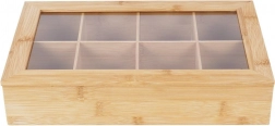 Eleganckie bambusowe pudełko na herbatę z 8 przegródkami i przezroczystą pokrywką utrzyma Twoje ulubione herbaty przejrzyście uporządkowane oraz dłużej świeże i aromatyczne. Naturalny bambus jest odporny na wilgoć, nie odkształca się i nie pochłania zapachów, dzięki czemu idealnie sprawdzi się w kuchni i w gastronomii.