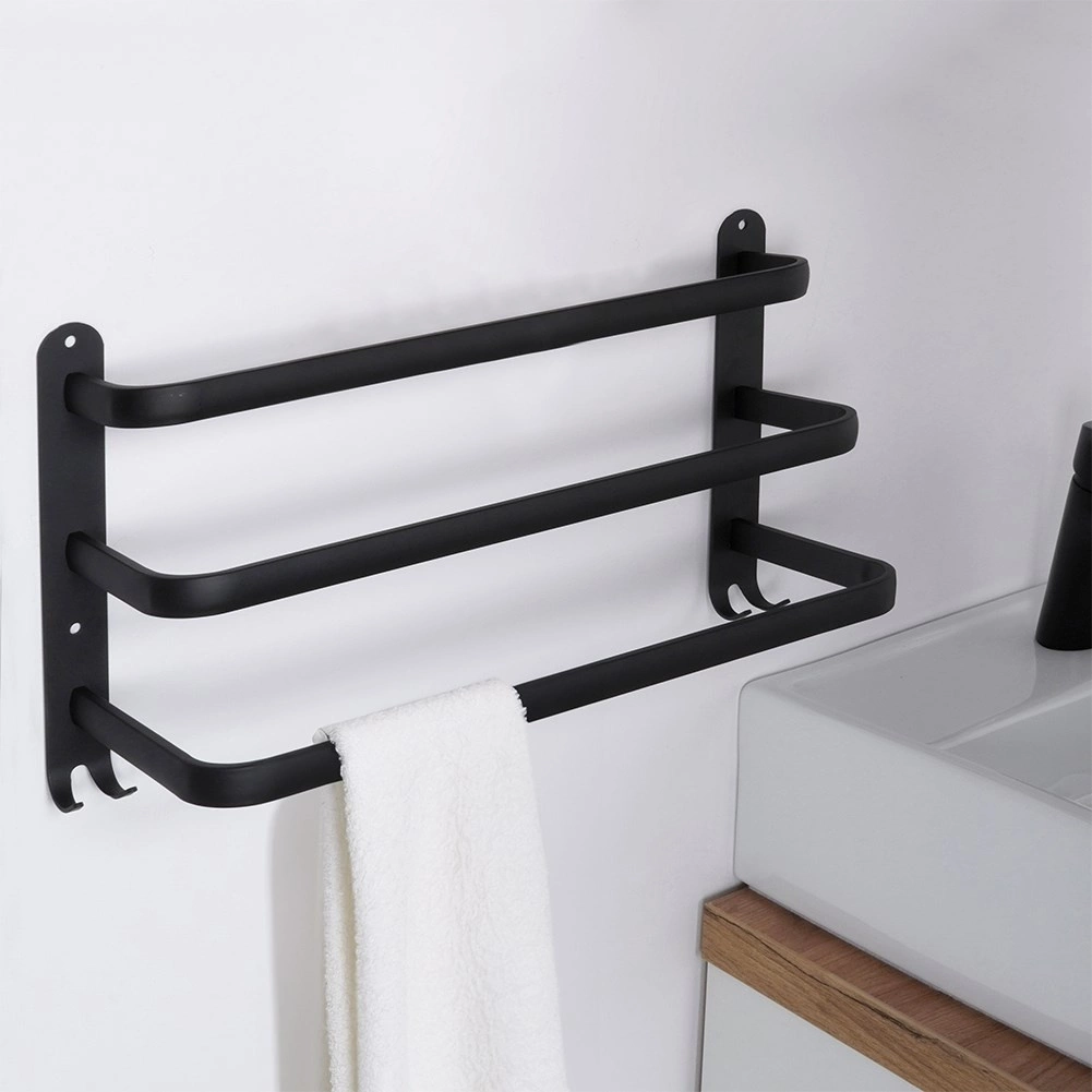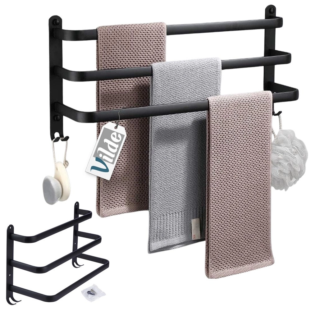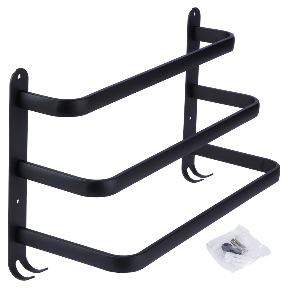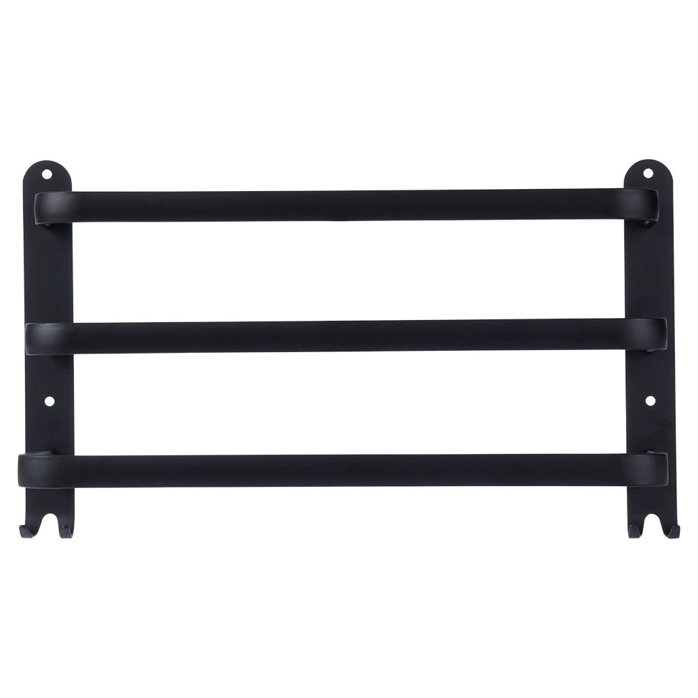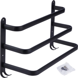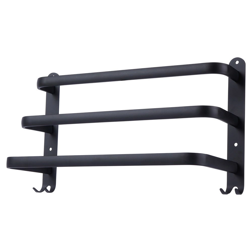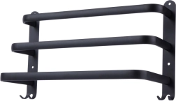 Stylowy i trwały uchwyt na ręczniki dla przejrzystej organizacji Twojej łazienki. Trzy poziome drążki umożliwiają efektywne suszenie i wietrzenie ręczników, a cztery haczyki w dolnej części zapewniają miejsce na myjki czy akcesoria. Minimalistyczny design w matowej czerni podkreśli charakter wnętrz w stylu skandynawskim, nowoczesnym i loftowym.