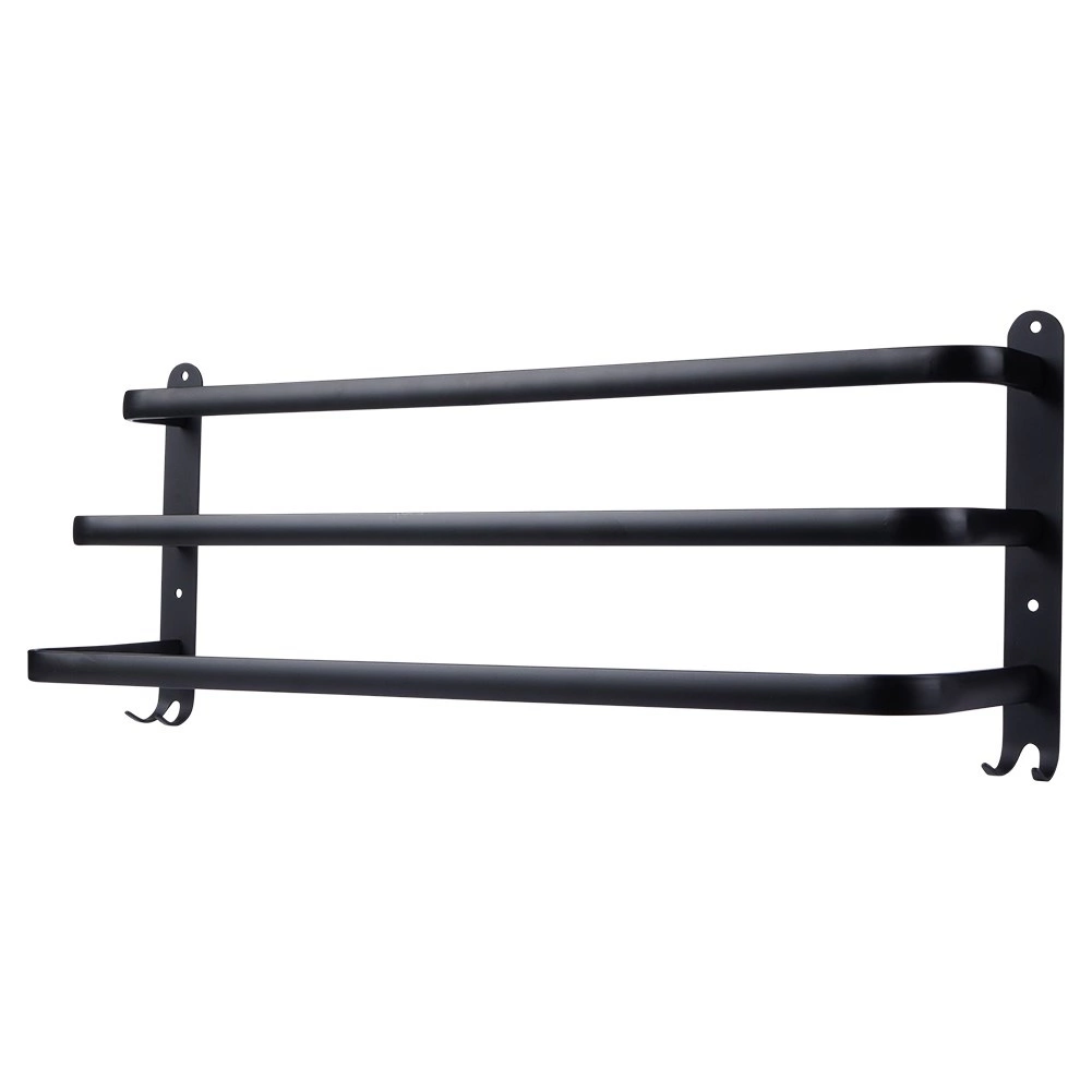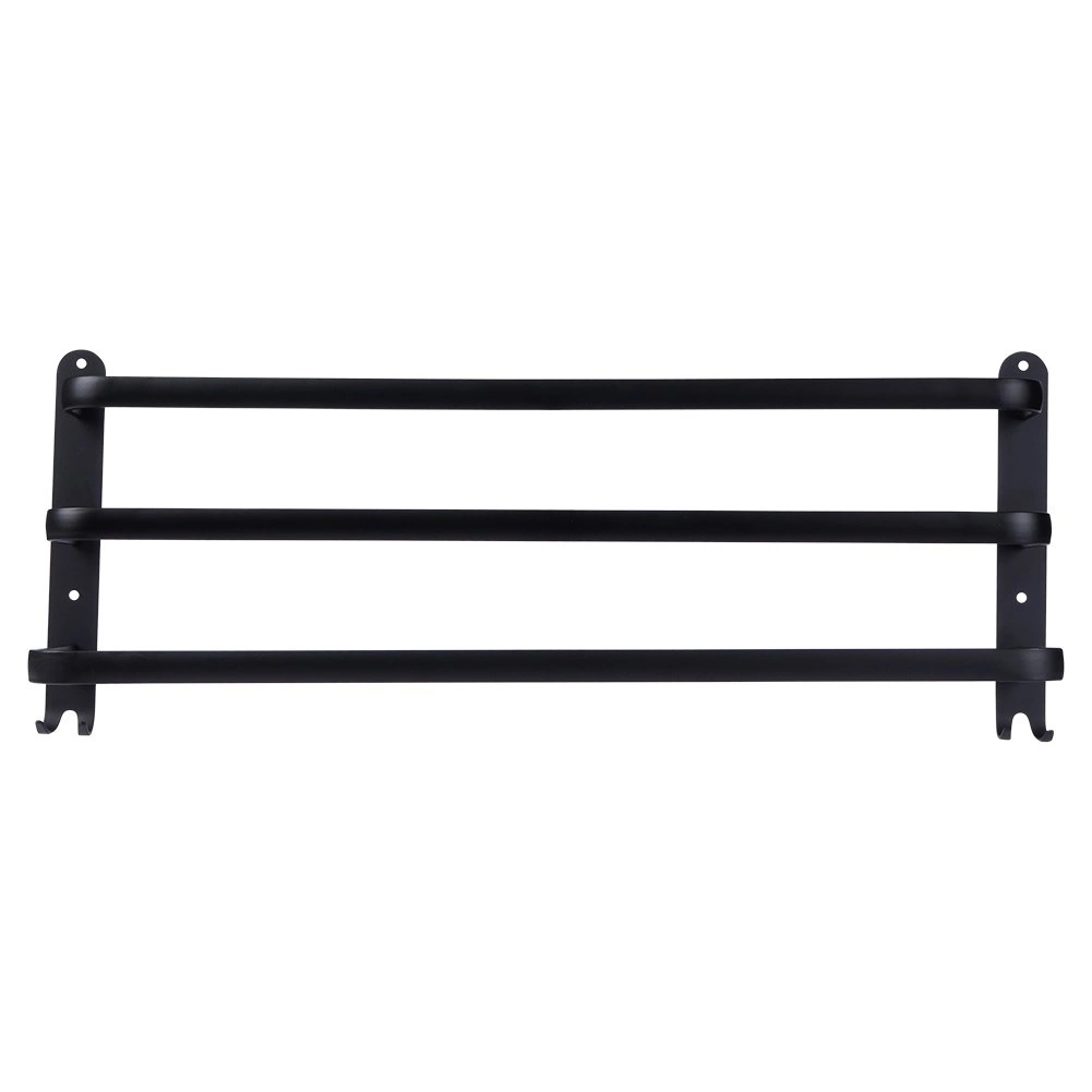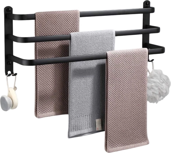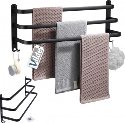 Stylowy ścienny uchwyt na ręczniki o długości 60 cm oferuje trzy drążki i cztery haczyki dla maksymalnego porządku w łazience. Wykonany z trwałego aluminium w kolorze matowej czerni, świetnie komponuje się z nowoczesnymi i industrialnymi wnętrzami oraz umożliwia łatwy montaż za pomocą śrub, kleju lub taśmy 3M.