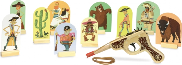 Ustaw tarcze, naciągnij gumkę i wyzwij rodzinę lub przyjaciół na pojedynek w salonie. Wysokiej jakości drewniane wykonanie zapewnia trwałość i długą żywotność zabawki, a atrakcyjny westernowy design zachwyci małych rewolwerowców.