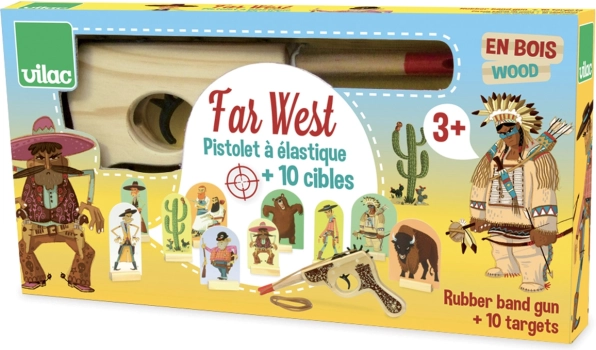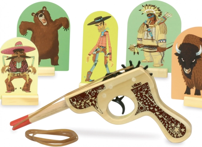 Poczuj atmosferę Dzikiego Zachodu z tym drewnianym pistoletem z tarczami marki VILAC. Gra jest idealna dla dzieci od 3 lat i pomaga trenować celność, koncentrację oraz motorykę małą. Wystarczy naciągnąć gumkę, ustawić tarcze i zacząć strzelać – zabawa dla całej rodziny.
