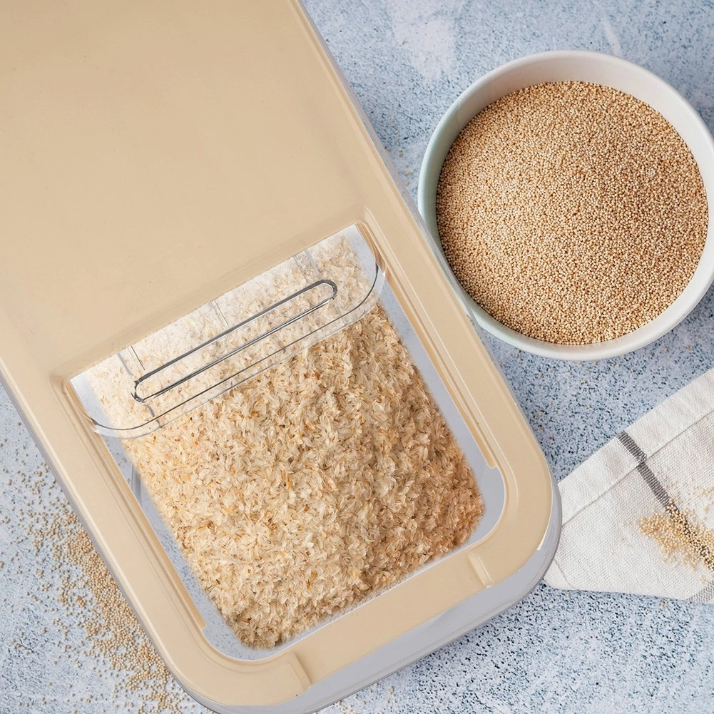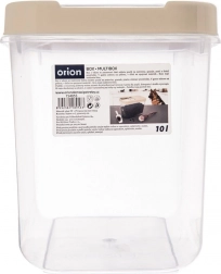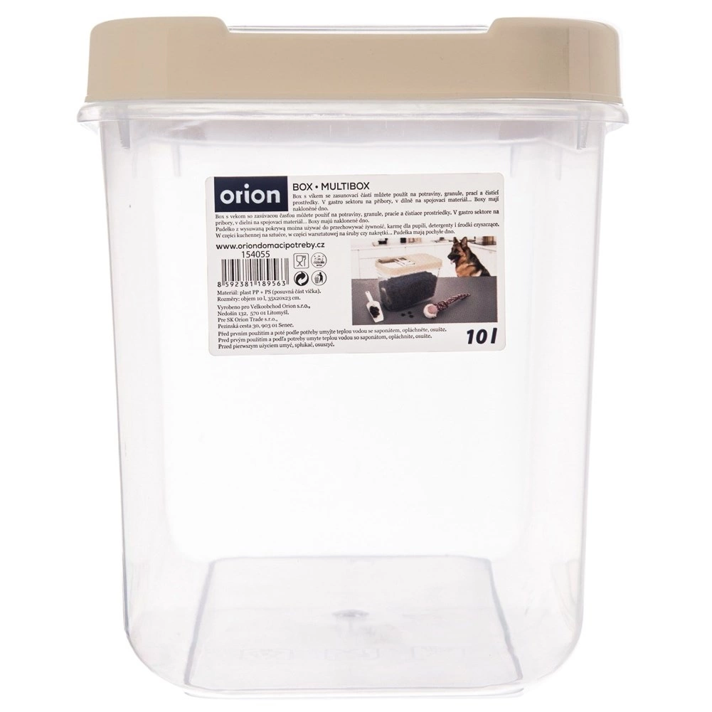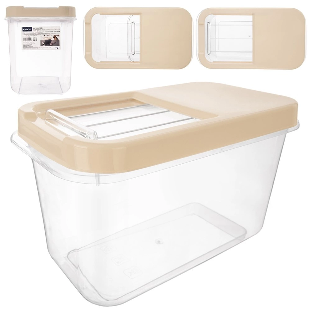 Praktyczny pojemnik o pojemności 10 l z przezroczystym korpusem i przesuwną pokrywką w kolorze beżowym dla łatwego dozowania. Odpowiedni na suche produkty spożywcze, kapsułki i proszek do prania, karmę dla zwierząt domowych oraz drobiazgi do domu. Wykonany z bezpiecznego plastiku bez BPA, łatwy w utrzymaniu, a dzięki przezroczystym ściankom zawsze widać zawartość.