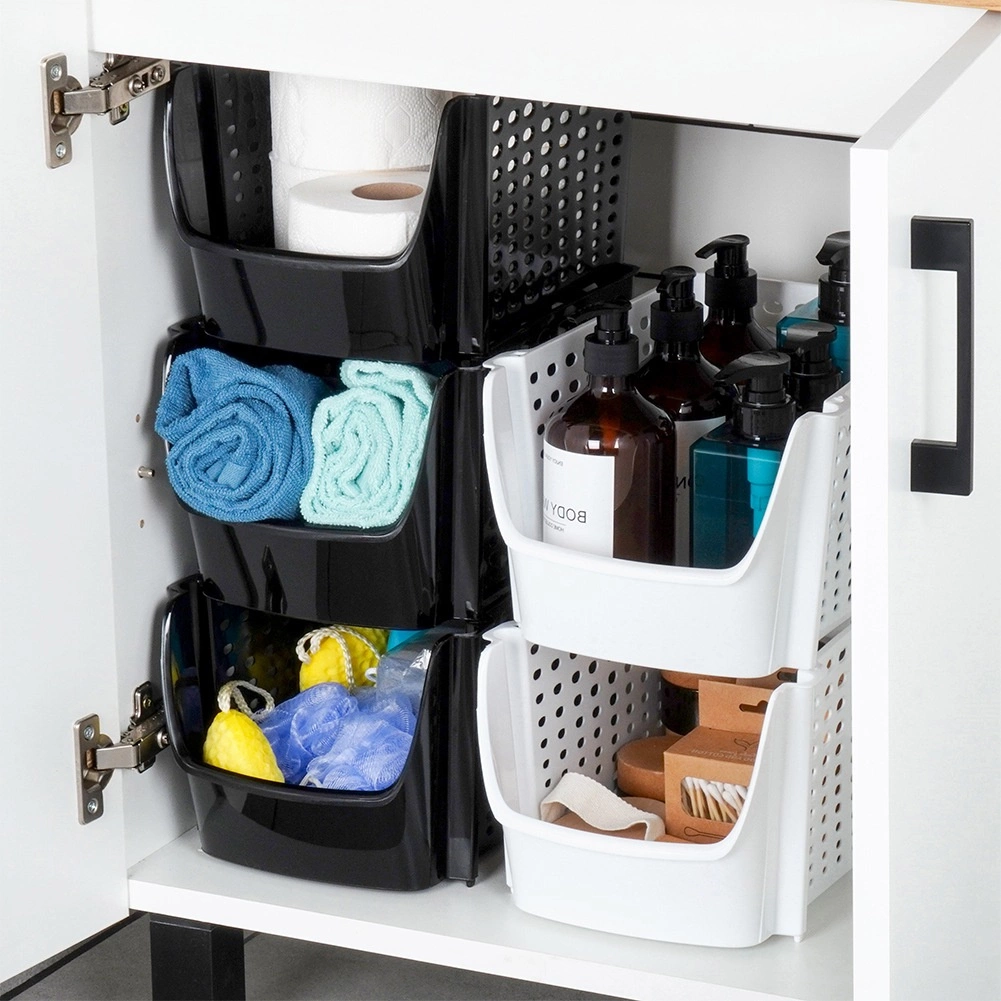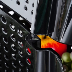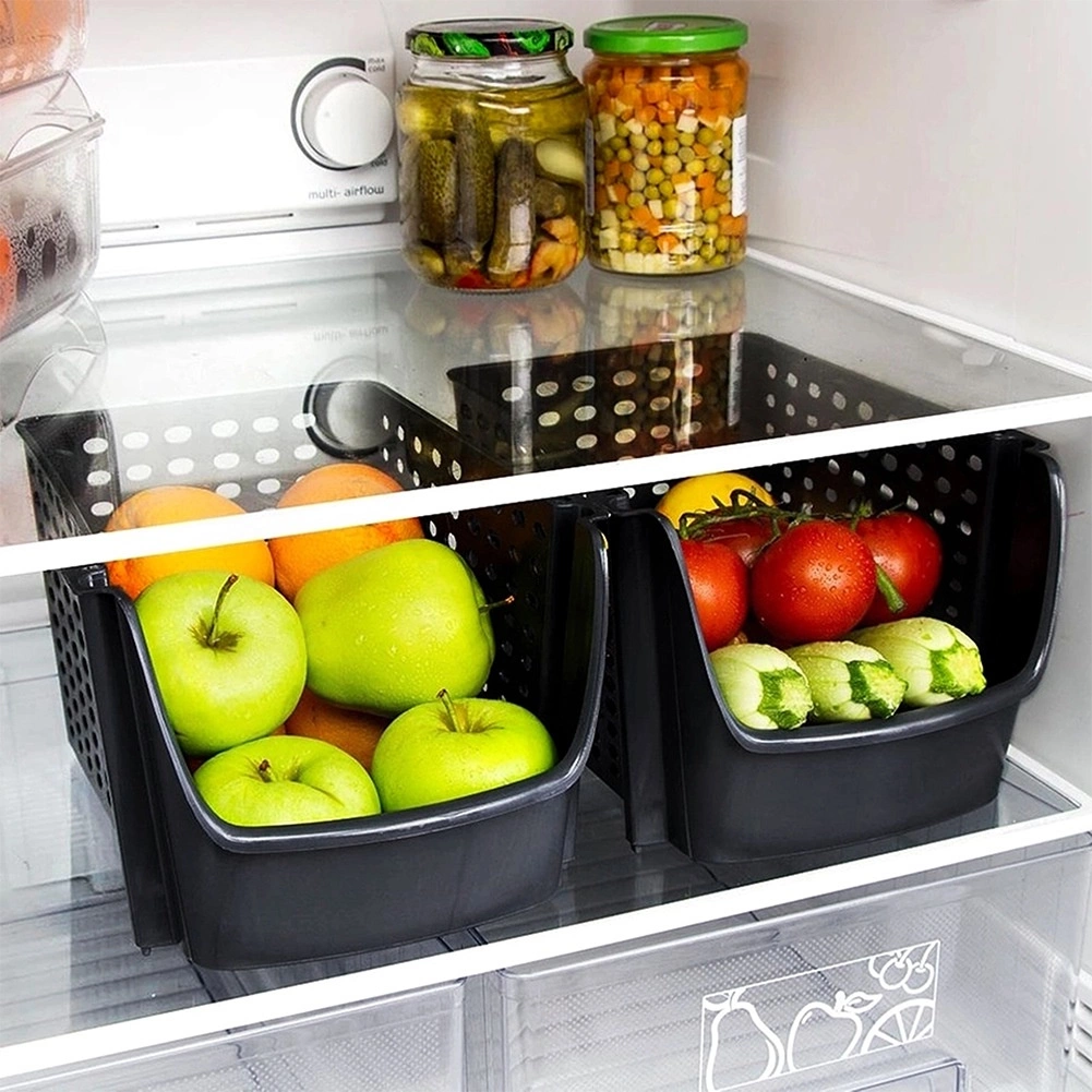 Uniwersalny koszyk z wytrzymałego tworzywa bez BPA jest idealny do codziennej organizacji kuchni. Perforowane ścianki wspierają cyrkulację powietrza, co pomaga utrzymać owoce i warzywa dłużej świeże. Otwarty przedni wycięty panel umożliwia szybkie wkładanie i wyjmowanie zawartości, niezależnie od tego, czy koszyk stoi na blacie roboczym, czy jest wsunięty na półkę.