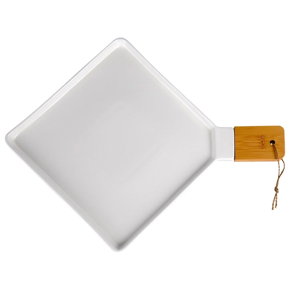 Porcelanowy półmisek do serwowania TERRESTRIAL łączy nowoczesny design z maksymalną funkcjonalnością. Kwadratowa powierzchnia z podwyższoną krawędzią utrzymuje potrawy bezpiecznie na miejscu, a ergonomiczna bambusowa rączka zapewnia komfortowe i bezpieczne przenoszenie z kuchni na stół. Doskonały do dań zimnych i ciepłych – od serów i tapas po mięsa, owoce czy desery.