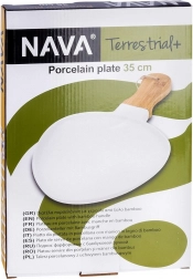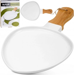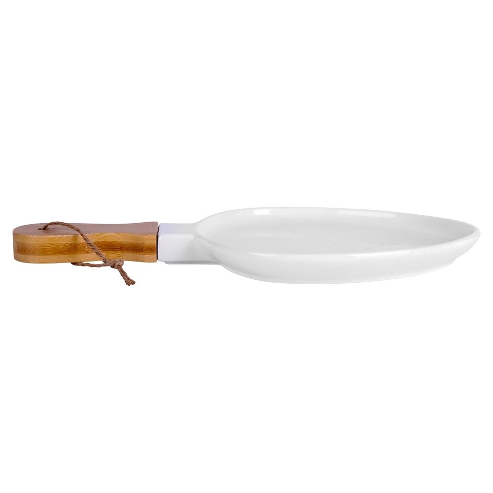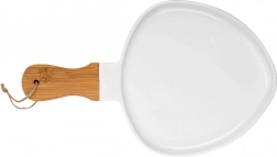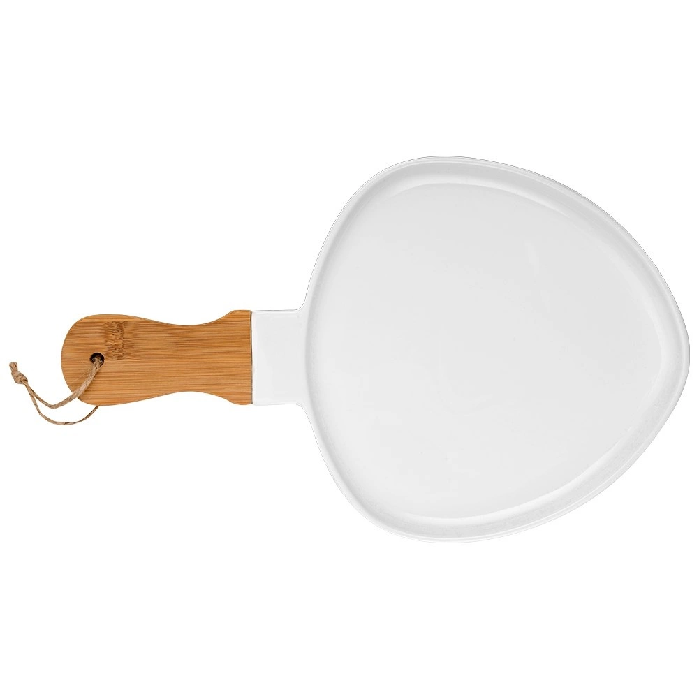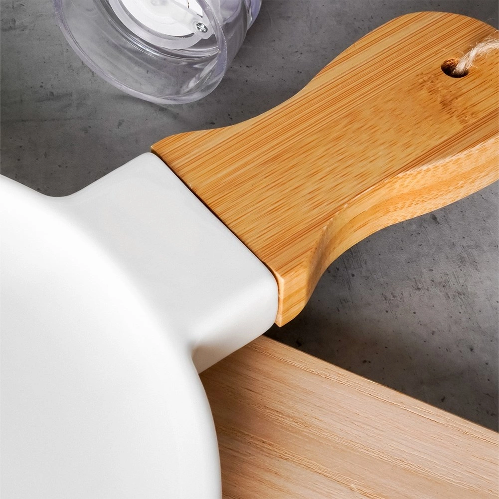 Dzięki wygodnemu chwytowi z otworem i sznurkiem talerz łatwo przenosić i można go również zawiesić, oszczędzając miejsce. Wyróżnia się uniwersalnym zastosowaniem w domu, restauracji i przy wyjątkowych okazjach. Połączenie naturalnego bambusowego uchwytu i białej, szkliwionej porcelany prezentuje się elegancko i reprezentacyjnie.