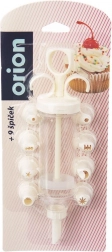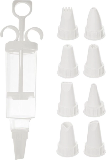Praktyczny zestaw do dekorowania tortów, deserów i kanapeczek z 9 wymiennymi tylkami oraz precyzyjnym tłokowym dozowaniem. Wytrzymałe wykonanie z wysokiej jakości plastiku, przezroczyste korpus do kontroli ilości kremu i łatwego użytkowania oraz czyszczenia. Idealny do kremów, bitej śmietany i nadzień.