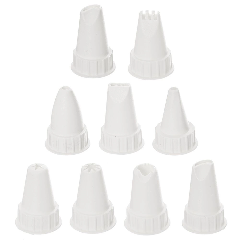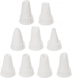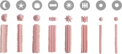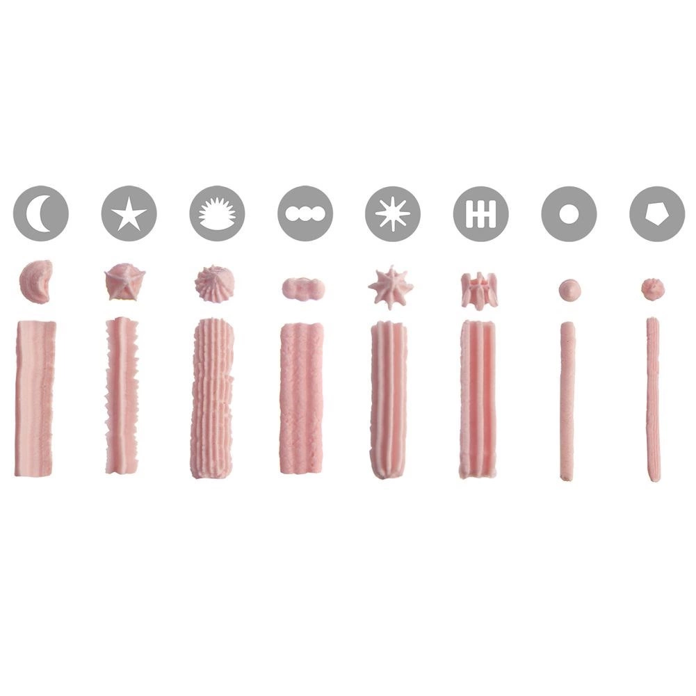 - 9 wymiennych tylek do różnych wzorów – linie, gwiazdki, kwiaty, fale oraz napełnianie.