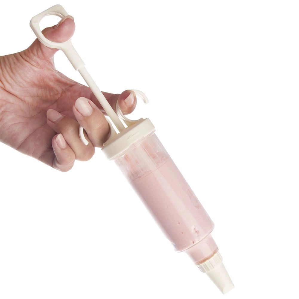 Uniwersalny dekorator do tortów i ciastek łatwo napełnia się kremem lub bitą śmietaną, a dzięki tłokowemu sterowaniu zapewnia równomierne i czyste dozowanie. Przezroczysty cylinder pozwala kontrolować poziom nadzienia, a wymienne tylki oferują szerokie możliwości dekoracji – od delikatnych linii po bogate gwiazdki.