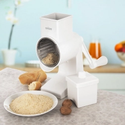Praktyczna ręczna tarka obrotowa z korbką i wymiennym bębnem ze stali nierdzewnej do łatwego tarcia i mielenia. Dzięki solidnemu mocowaniu do stołu praca jest stabilna, bezpieczna i bez poślizgu. Idealna do domowej bułki tartej, orzechów, czekolady, serów, warzyw i owoców.