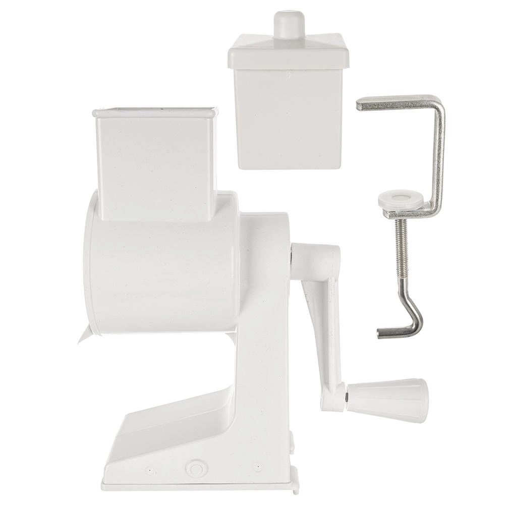 Odkryj niezawodną ręczną tarkę, która stanie się niezbędnym pomocnikiem w każdej kuchni. Solidne plastikowe korpus w białym kolorze i bęben ze stali nierdzewnej gwarantują długą żywotność i łatwą konserwację. Dzięki śrubowemu mocowaniu do blatu roboczego (maks. 5,5 cm) urządzenie pozostaje podczas pracy doskonale stabilne.