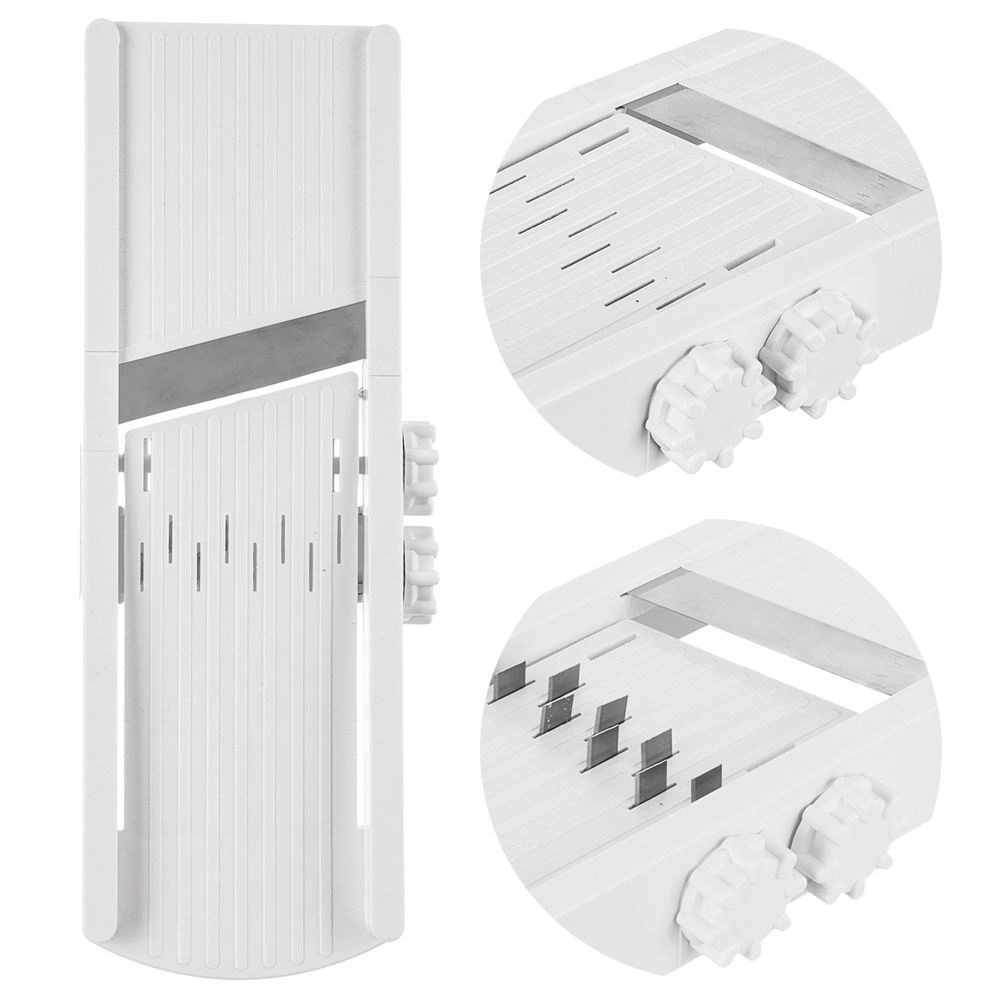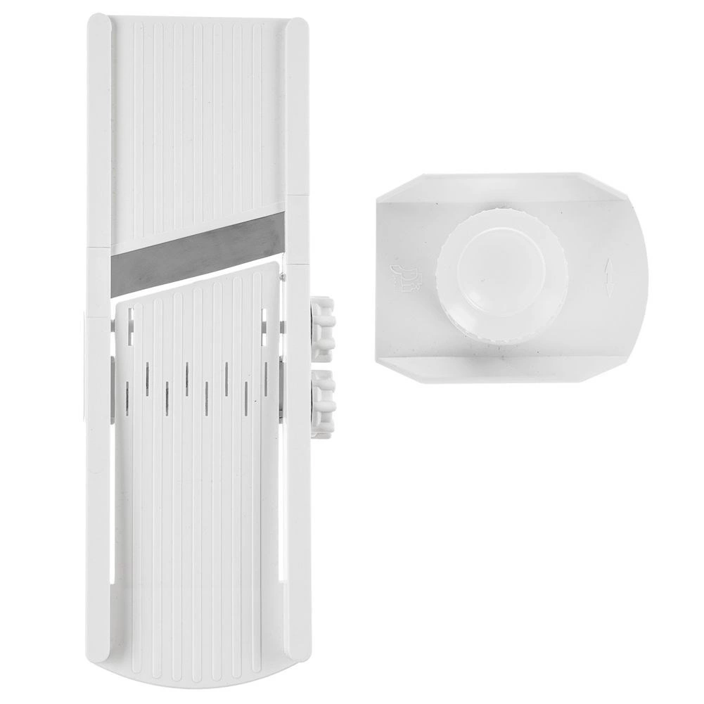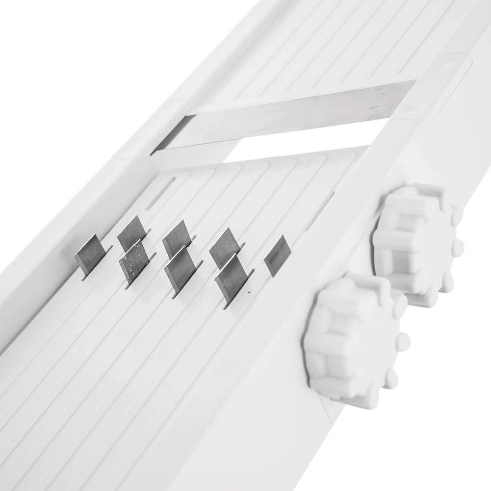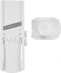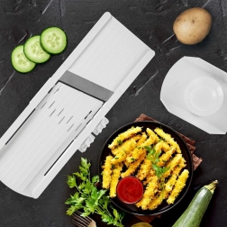 Ta wytrzymała mandolina w białym kolorze łączy szybkość, precyzję i bezpieczeństwo podczas krojenia owoców i warzyw. Płynna regulacja grubości za pomocą bocznego pokrętła pozwala kroić od bardzo cienkich plastrów po grubsze do 8 mm – idealne do ogórków do sałatek, plastrów na grilla, chrupiących chipsów i domowych frytek.