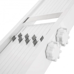 Ostre ostrza ze stali nierdzewnej gwarantują czyste i równomierne cięcie, a ochronny uchwyt utrzymuje składniki stabilnie na miejscu i minimalizuje ryzyko skaleczenia. Akcesorium jest łatwe do mycia i nadaje się do zmywarki, więc utrzymanie czystości to kwestia chwili.