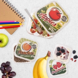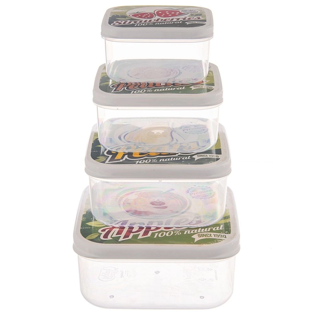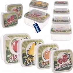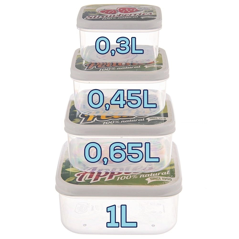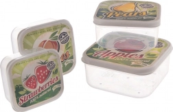 Zestaw zawiera 4 pojemniki na żywność o pojemności 900 ml, 600 ml, 400 ml i 250 ml. Kwadratowy kształt oszczędza miejsce w lodówce i torbie, a przezroczyste ścianki ułatwiają szybką orientację. Kolorowe pokrywki z motywami jabłka, gruszki, brzoskwini i truskawki dodają kuchni stylowego, retro charakteru.