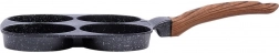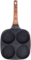 Praktyczna patelnia z czterema okrągłymi formami o średnicy 8,5 cm do idealnie ukształtowanych jajek, racuchów i mini naleśników. Wytrzymałe aluminiowe korpus z nieprzywierającą, granitową powłoką w czarnym kolorze umożliwia gotowanie z minimum tłuszczu, równomiernie przewodzi ciepło i oszczędza czas oraz energię. Ergonomiczny uchwyt z drewnianym dekorem jest wygodny, antypoślizgowy i ma otwór do zawieszenia. Patelnia jest odpowiednia na gaz, prąd, płytę ceramiczną, halogen oraz indukcję i jest łatwa w czyszczeniu, również w zmywarce.