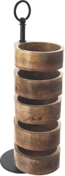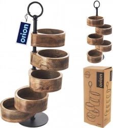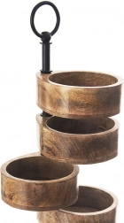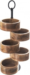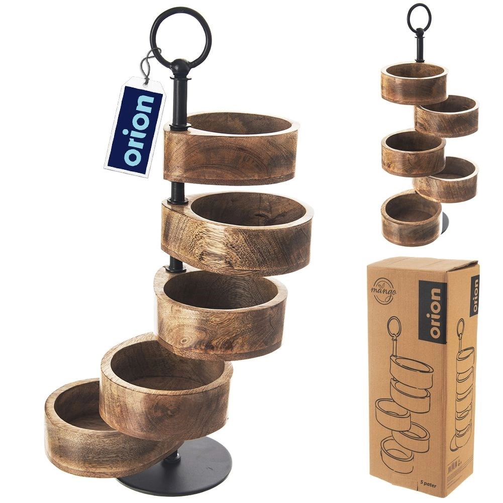 Ta wielopoziomowa etażerka z drewna mango o wysokości 44,5 cm oferuje elegancki sposób serwowania orzechów, chipsów, suszonych owoców, słodyczy, ciasteczek czy tapas. Pięć niezależnie obrotowych miseczek pozwala na atrakcyjne aranżacje i łatwy dostęp dla gości. Naturalne drewno mango jest odporne na wilgoć i odkształcenia, nie pochłania zapachów i szybko schnie.