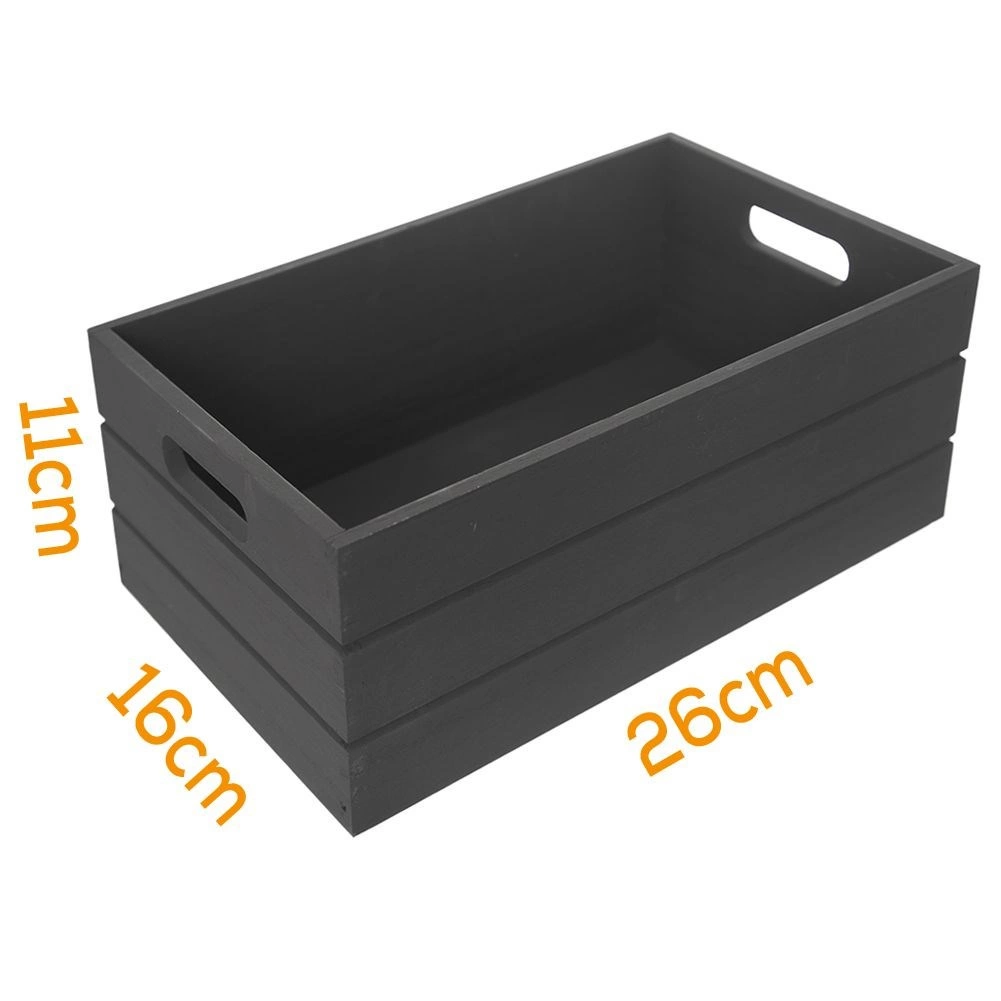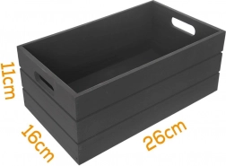 Praktyczna drewniana skrzynka w eleganckim czarnym kolorze pomoże utrzymać porządek w każdym pomieszczeniu. Wykonana z wytrzymałego drewna, ma zintegrowane uchwyty dla łatwego przenoszenia oraz kompaktowe wymiary 26 × 16 × 11 cm. Świetnie sprawdzi się na kosmetyki, artykuły biurowe, przyprawy, akcesoria kuchenne i drobną odzież. Uniwersalna, trwała i dekoracyjna – doskonale wpasuje się w klasyczne i nowoczesne wnętrza.