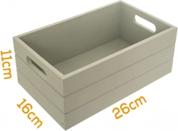 Praktyczna i stylowa drewniana skrzynka o wymiarach 26 × 16 × 11 cm do przejrzystego przechowywania drobiazgów w domu i biurze. Wykonana z wytrzymałego drewna, ma pastelowy, jasny zielony kolor, otwarty wierzch dla łatwego dostępu oraz boczne uchwyty dla wygodnego przenoszenia. Doskonale sprawdzi się na kosmetyki, artykuły biurowe, żywność, przyprawy, owoce i warzywa, a także jako element dekoracyjny do każdego wnętrza.