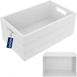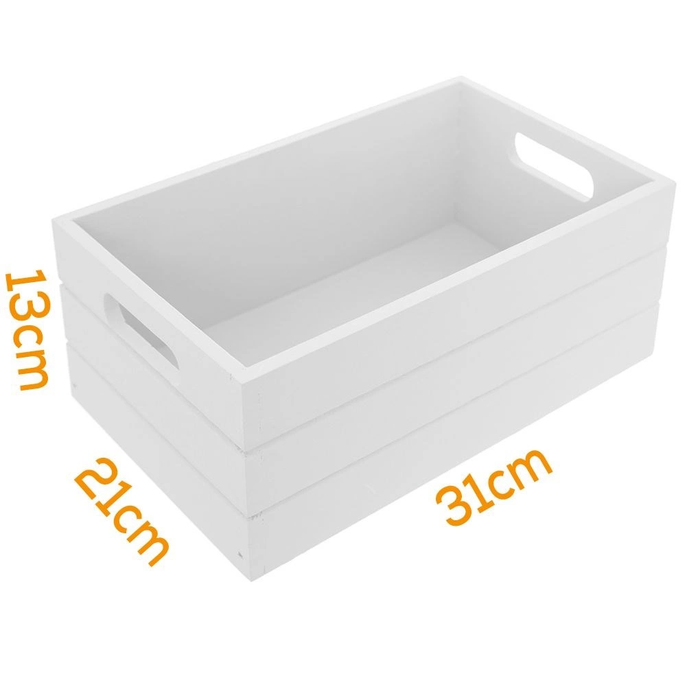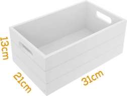 Praktyczna drewniana skrzynka w białym kolorze do przejrzystego przechowywania rzeczy w domu i biurze. Ma kompaktowe wymiary 31 × 21 × 13 cm, zintegrowane uchwyty dla łatwego przenoszenia oraz solidną, stabilną konstrukcję. Doskonale nadaje się na kosmetyki, artykuły papiernicze, przyprawy, akcesoria kuchenne czy drobną odzież. Dzięki czystemu designowi sprawdzi się także jako element dekoracyjny lub organizer do półek, komód i na biurko.