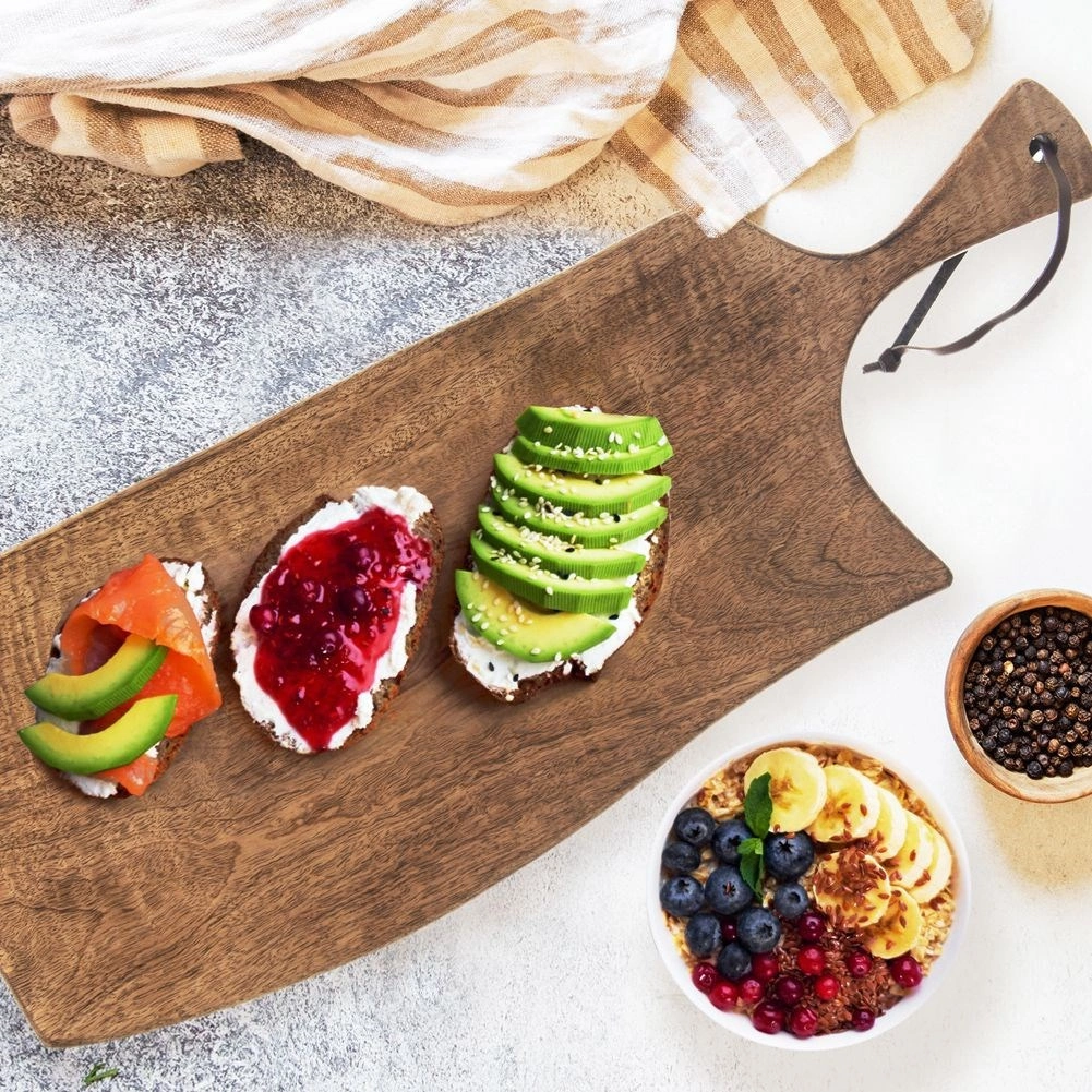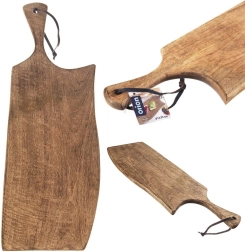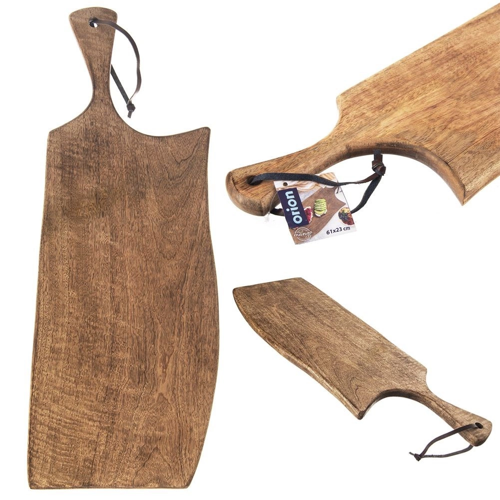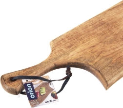 Praktyczny uchwyt ułatwia przenoszenie, a otwór ze skórzanym paskiem umożliwia łatwe zawieszenie i suszenie. Deska ma wymiary 61 × 22 × 2 cm, więc oferuje dużą powierzchnię roboczą i jednocześnie pięknie prezentuje się podczas serwowania.