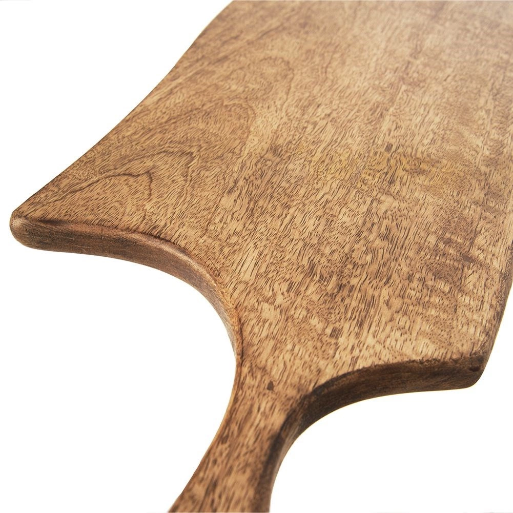 Ta długa deska z wysokiej jakości drewna mango świetnie sprawdzi się do krojenia mięsa, warzyw i owoców, a także jako taca do serwowania serów, wędlin czy tapas. Naturalny materiał jest wytrzymały i stabilny wymiarowo oraz dzięki swojej strukturze mniej pochłania zapachy.