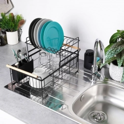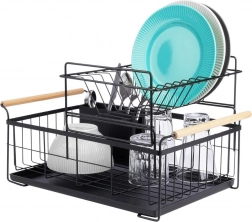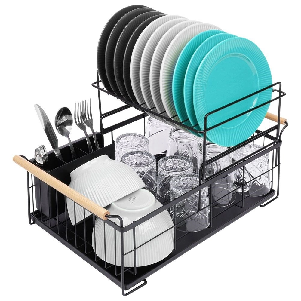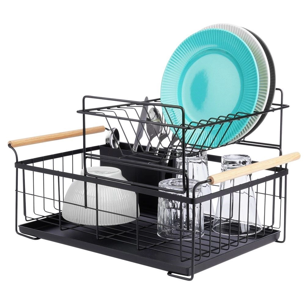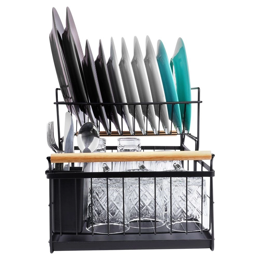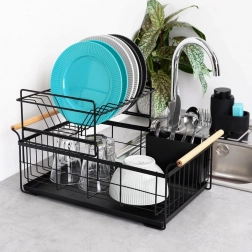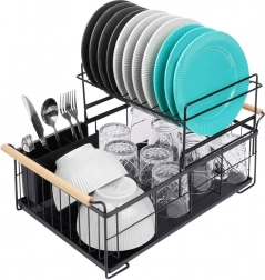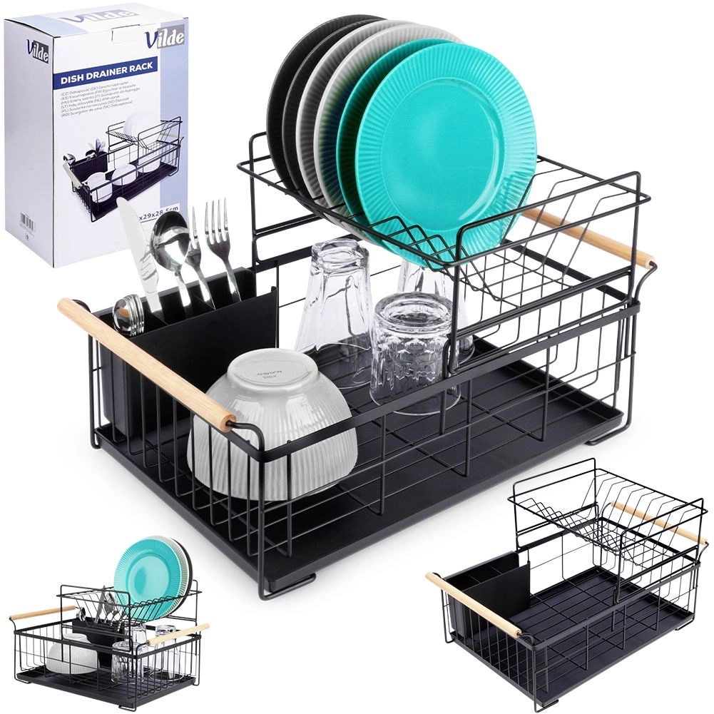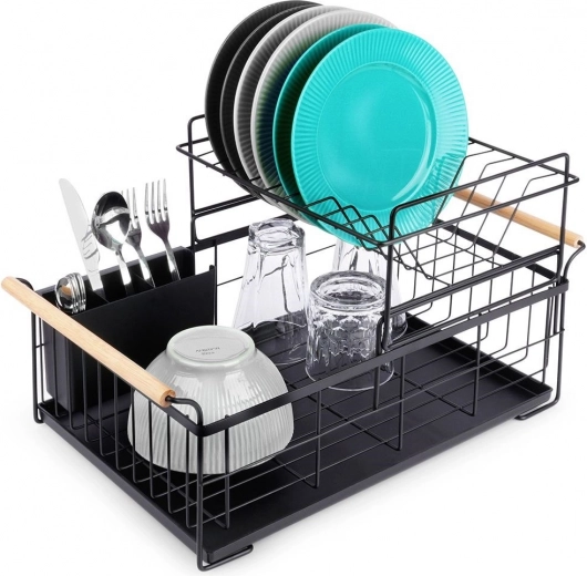 Elegancki dwupoziomowy ociekacz na naczynia w czarnym kolorze oszczędza miejsce i utrzymuje blat kuchenny suchy oraz uporządkowany. Oferuje wyjmowaną tackę ociekową, dwukomorowy koszyk na sztućce oraz praktyczne bambusowe uchwyty ułatwiające przenoszenie. Wykonany z wytrzymałego metalu, mieści talerze, miski, szklanki i sztućce, a do tego świetnie pasuje do wnętrz w stylu industrialnym. Dwupoziomowa konstrukcja zwiększa pojemność i przyspiesza suszenie naczyń.