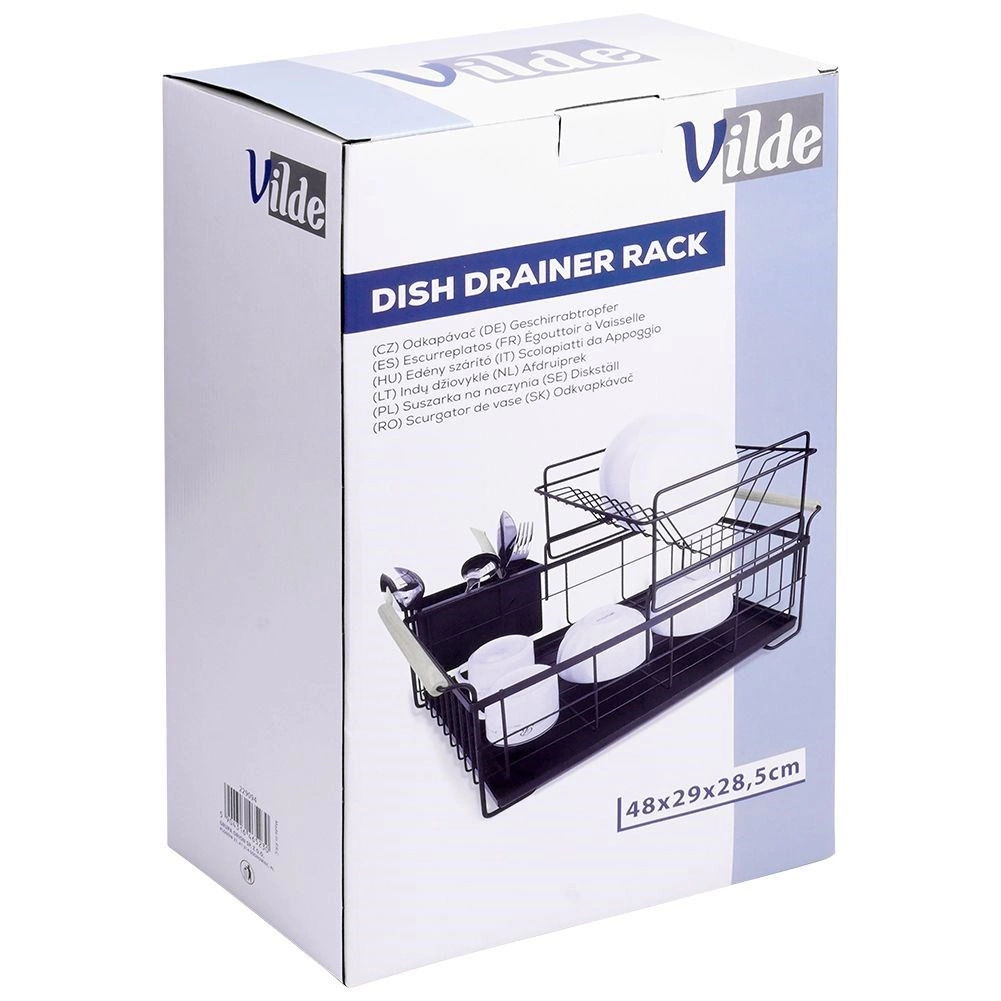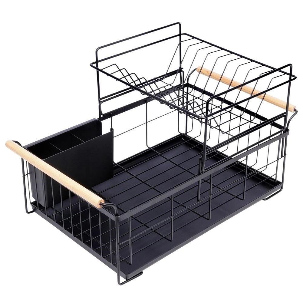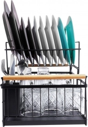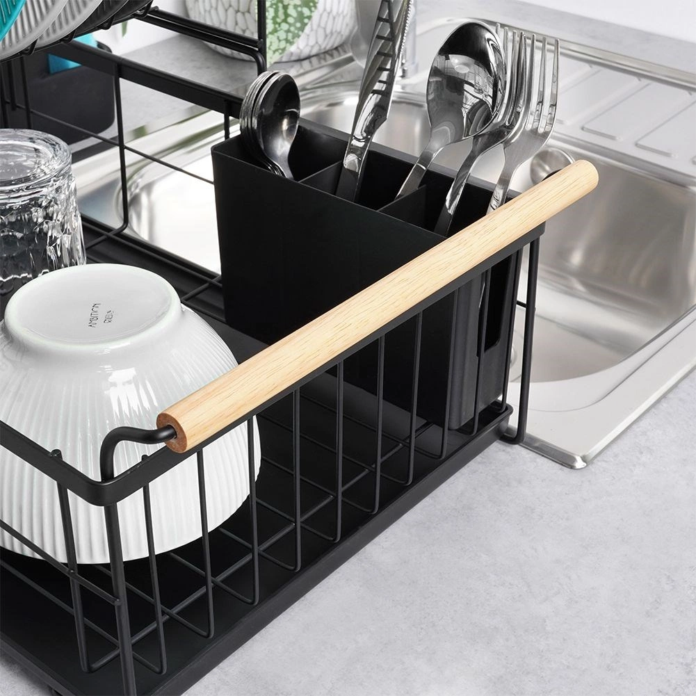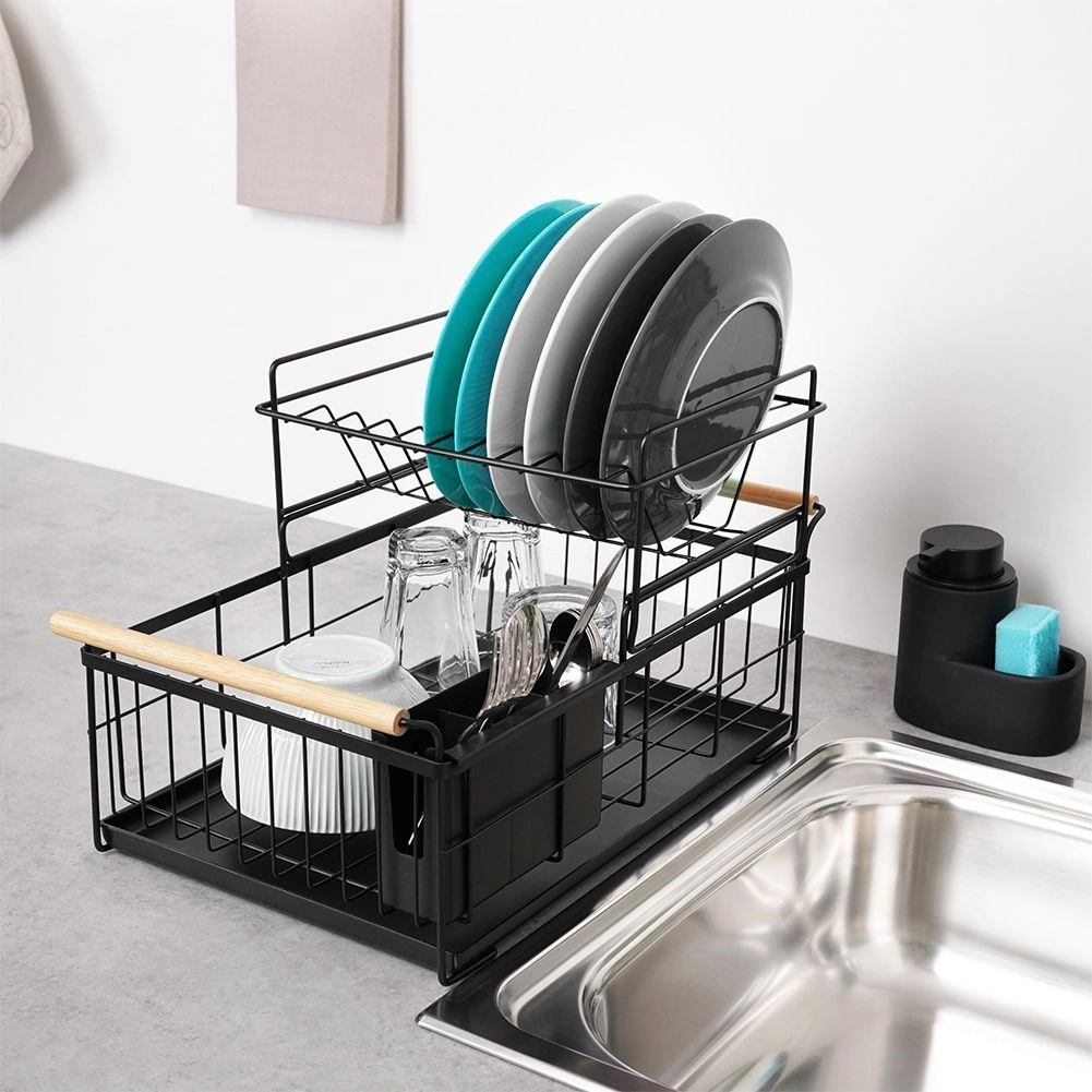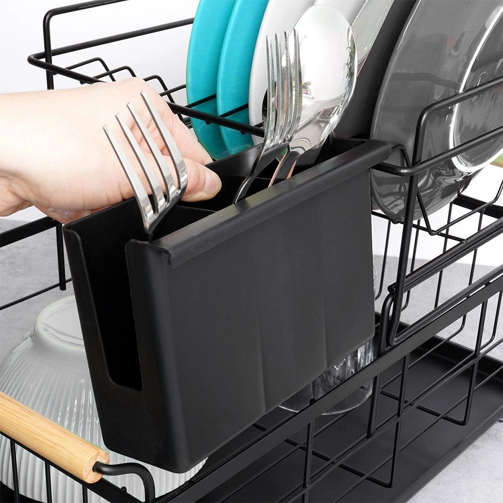 Elegancki dwupoziomowy ociekacz na naczynia w czarnym kolorze oszczędza miejsce i utrzymuje blat kuchenny suchy oraz uporządkowany. Oferuje wyjmowaną tackę ociekową, dwukomorowy koszyk na sztućce oraz praktyczne bambusowe uchwyty ułatwiające przenoszenie. Wykonany z wytrzymałego metalu, mieści talerze, miski, szklanki i sztućce, a do tego świetnie pasuje do wnętrz w stylu industrialnym. Dwupoziomowa konstrukcja zwiększa pojemność i przyspiesza suszenie naczyń.