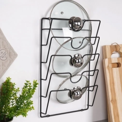 Montaż zajmuje chwilę – wystarczy przykręcić wieszak do ściany lub do drzwiczek szafki. Otwarta, druciana konstrukcja zapewnia łatwy dostęp, dobrą wentylację oraz jednocześnie chroni pokrywki przed uszkodzeniami.
