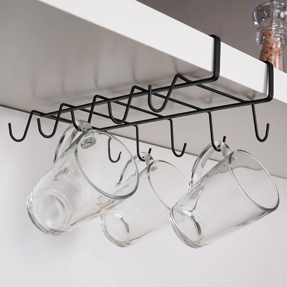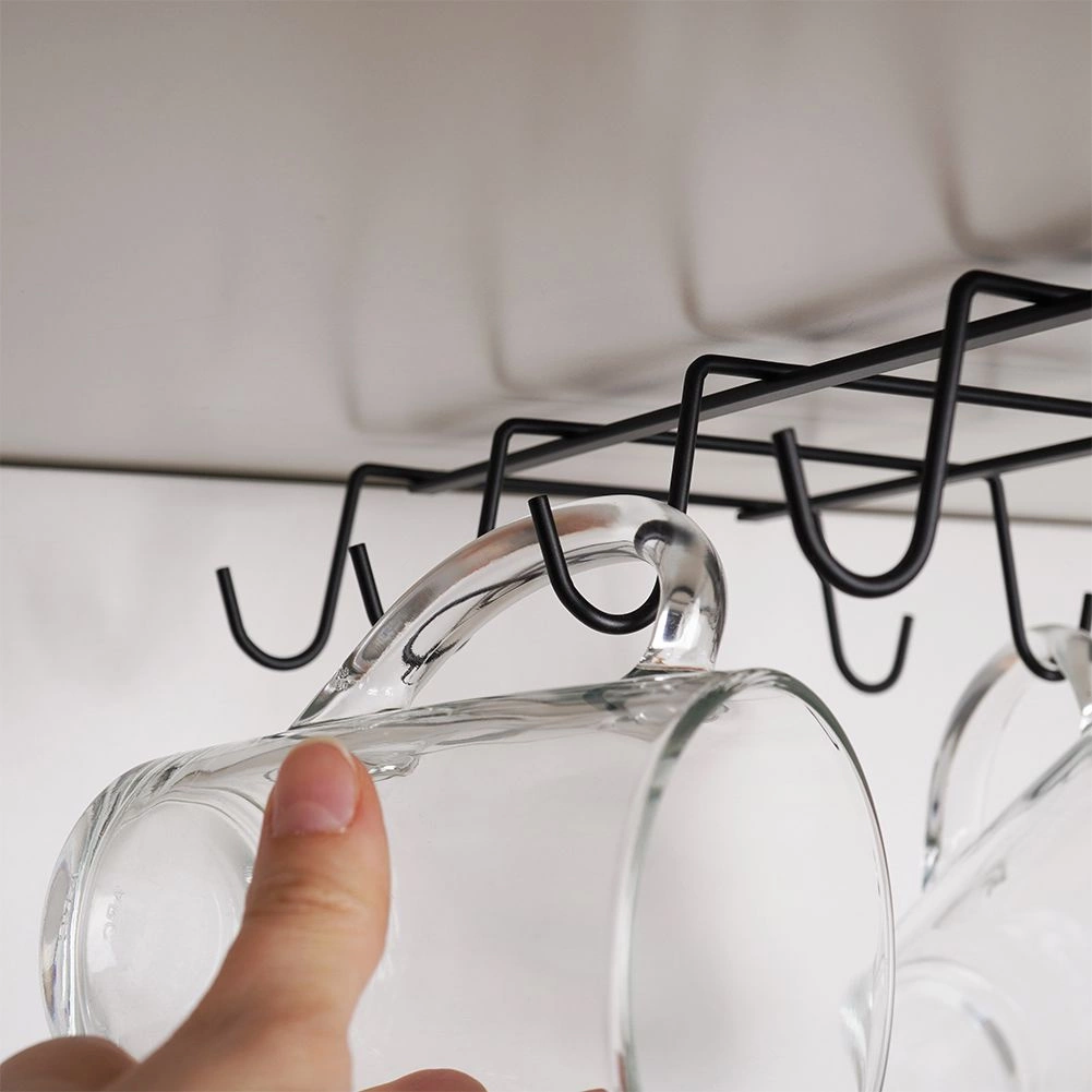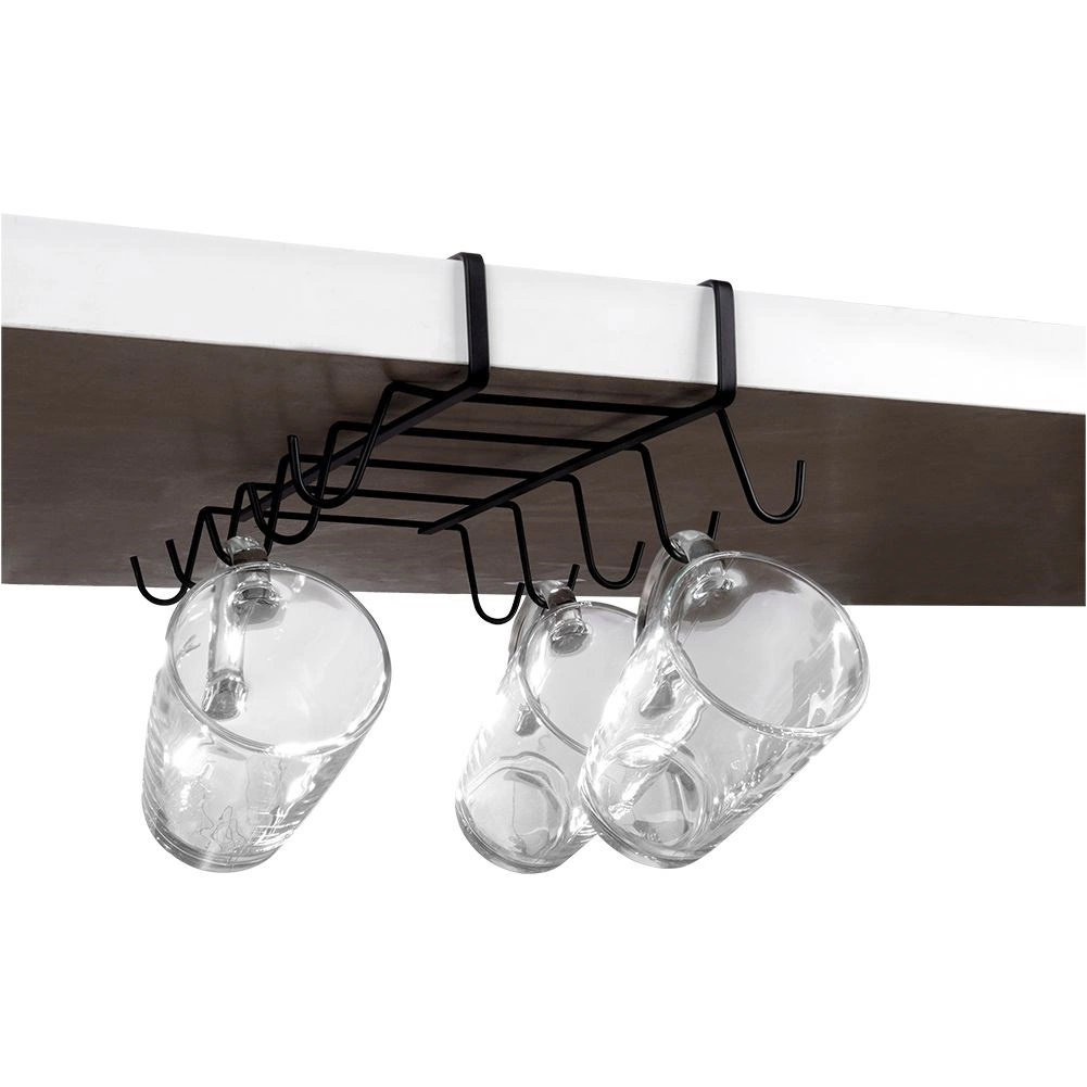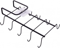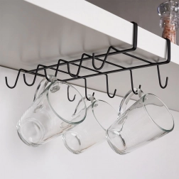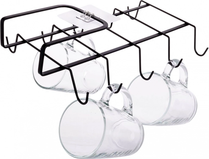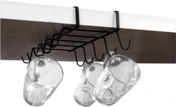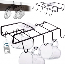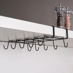 Praktyczny wiszący uchwyt pod półki i szafki pomoże zorganizować kuchnię i maksymalnie wykorzystać przestrzeń pionową. Dzięki dziesięciu hakom wygodnie przechowasz kubki, filiżanki i kuchenne akcesoria. Matowe czarne wykończenie nadaje wnętrzu loftowy charakter.