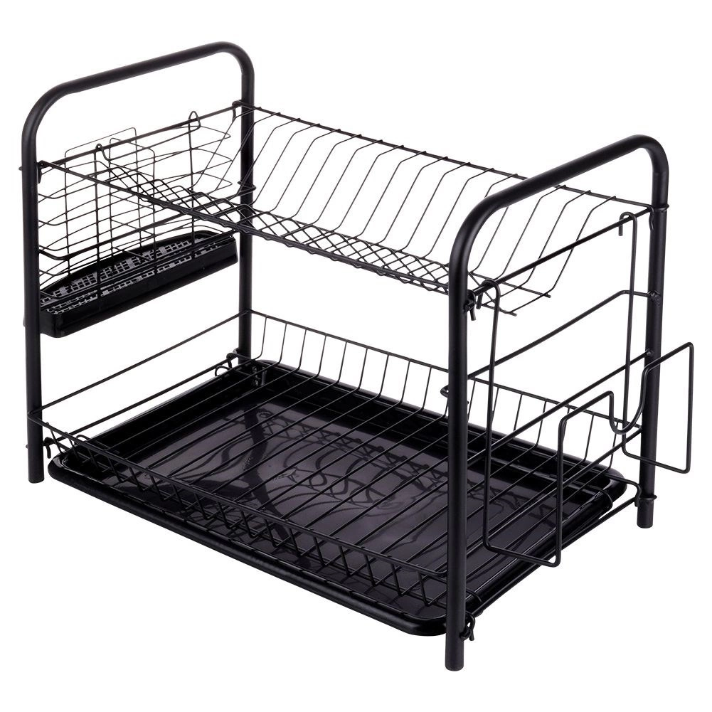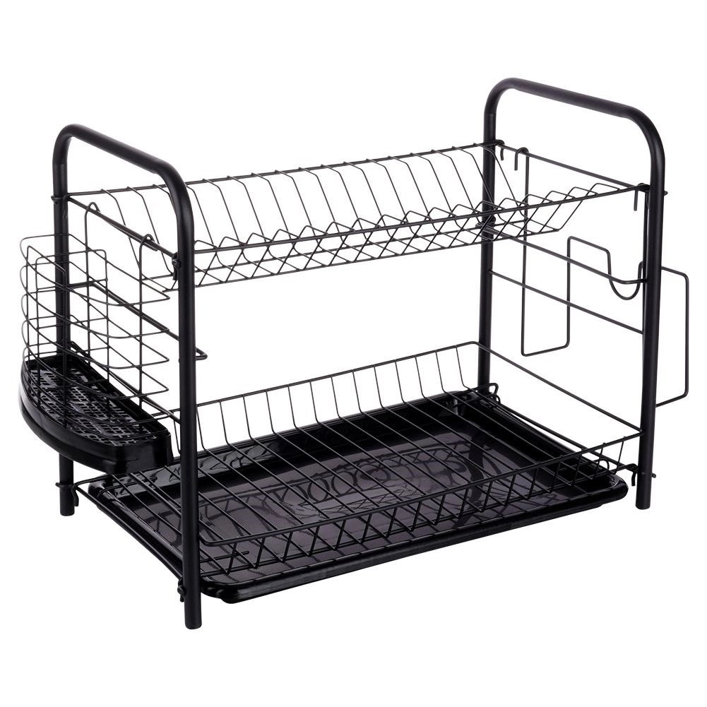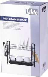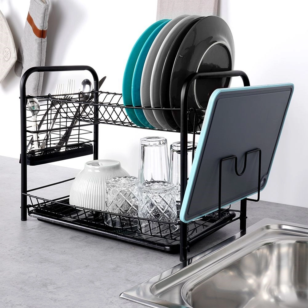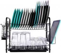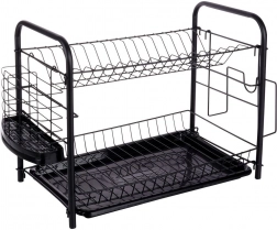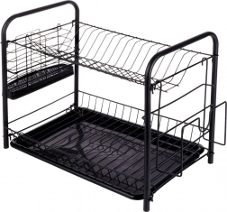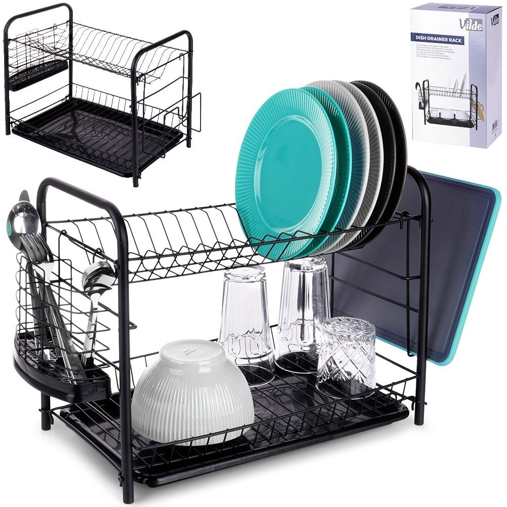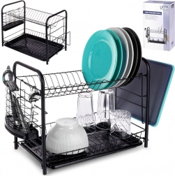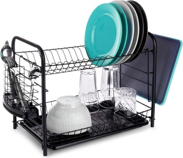 Praktyczny dwupoziomowy ociekacz na naczynia w czarnym kolorze oszczędza miejsce na blacie i przyspiesza suszenie talerzy, szklanek i sztućców. Dzięki dwóm poziomom jest wyjątkowo pojemny, ma wyjmowaną tackę ociekową, uchwyt na deskę do krojenia oraz oddzielny koszyk na sztućce. Solidna metalowa konstrukcja w industrialnym stylu zapewnia długą żywotność i stabilność.