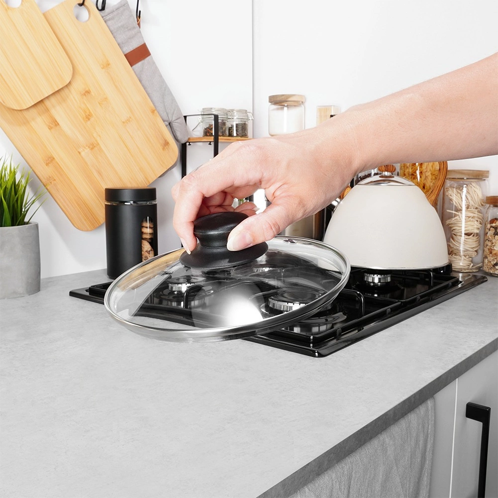 Dzięki przezroczystemu szkłu możesz wygodnie obserwować przebieg gotowania i zminimalizować utratę ciepła. Zintegrowany otwór odpowietrzający skutecznie odprowadza nadmiar pary, co zapobiega wykipieniu i zabrudzeniom płyty grzewczej. Wysoki rant zapewnia ścisłe przyleganie do krawędzi naczynia i ogranicza pryskanie.