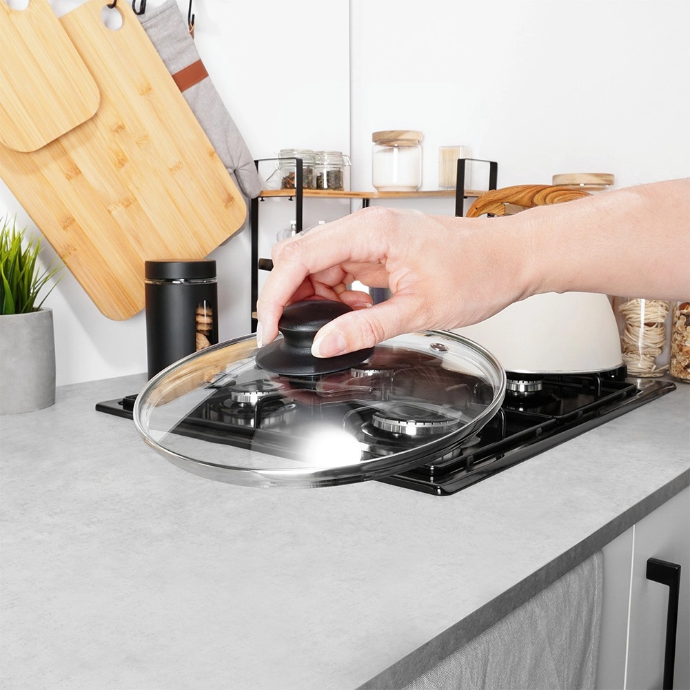 Dzięki otworowi odpowietrzającemu pokrywka uwalnia nadmiar pary i zmniejsza ryzyko wykipienia. Lekko wypukły kształt wspiera cyrkulację gorącego powietrza i równomierne przygotowanie potraw. Wysoki rant zapewnia stabilne, niemal hermetyczne przyleganie do naczynia i lepsze utrzymanie temperatury. Pokrywka jest odpowiednia do zmywarki i odporna na temperatury do 200 °C.