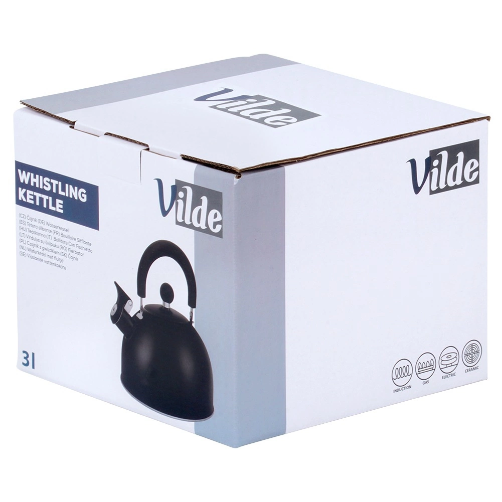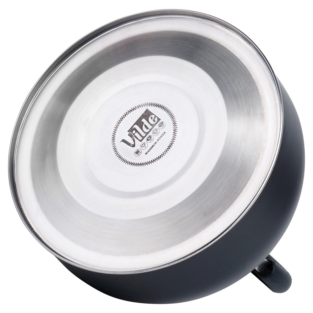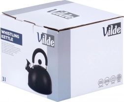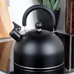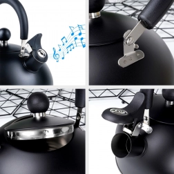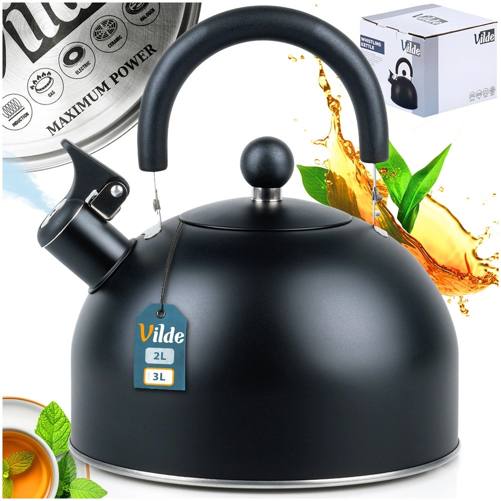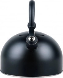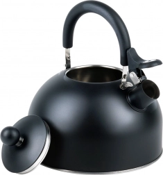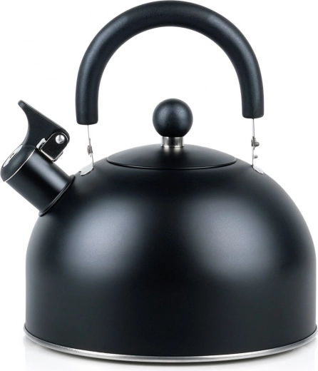 Stylowy czarny czajnik ze stali nierdzewnej o pojemności 3 l (pojemność użytkowa 2,4 l) z wygodnym składanym uchwytem i gwizdkiem. Dno akutermiczne zapewnia szybkie nagrzewanie nawet przy niskiej mocy oraz oszczędność energii. Odpowiedni na kuchenki gazowe, elektryczne, ceramiczne i indukcyjne. Eleganckie matowe wykończenie, łatwe w utrzymaniu.