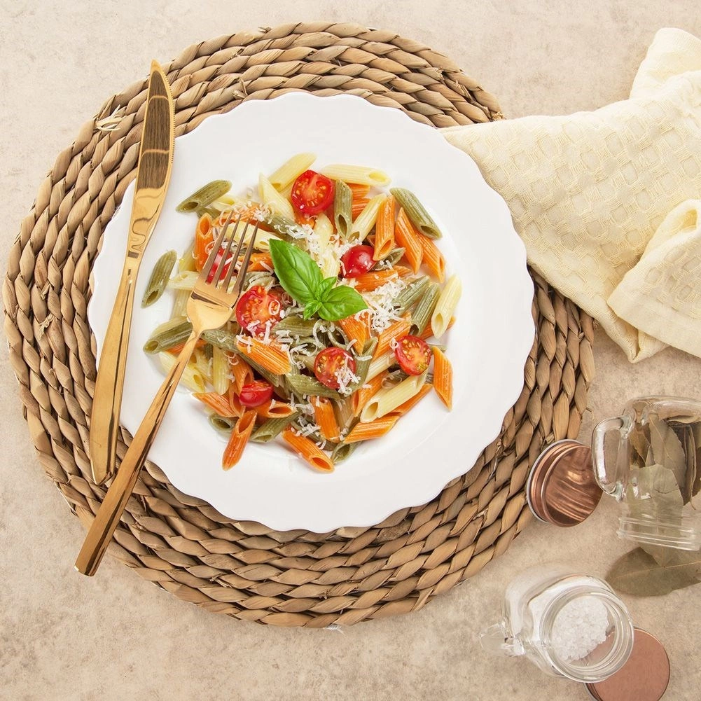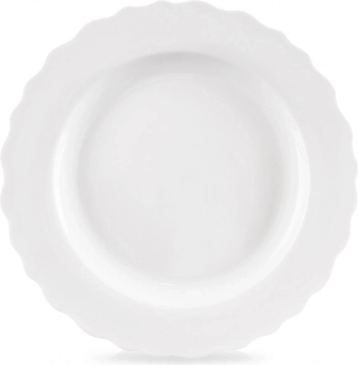 Uniwersalny porcelanowy talerz MONA wyróżnia się czystą bielą i eleganckim, falowanym rantem, który podkreśla wygląd każdego nakrycia stołu. Dzięki średnicy 24,5 cm jest idealny na obiady, kolacje i większe desery, a także świetnie komponuje się z innymi elementami z tej samej serii.