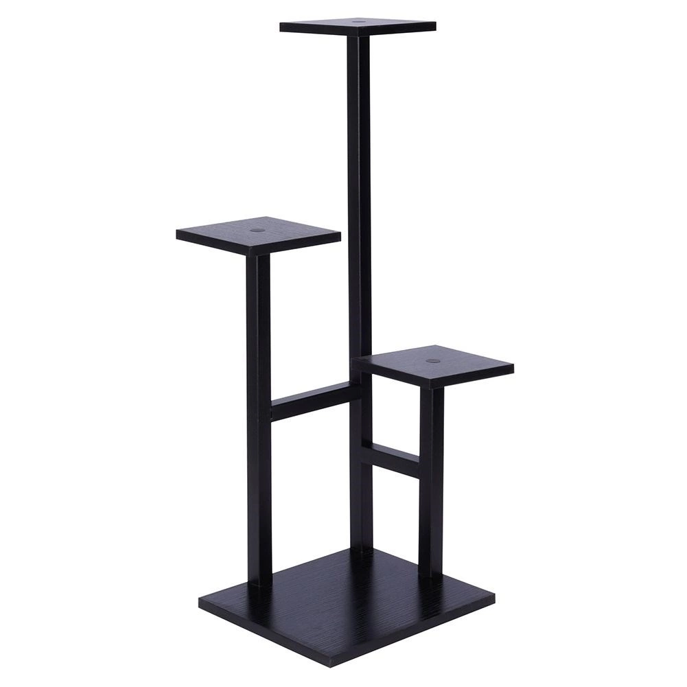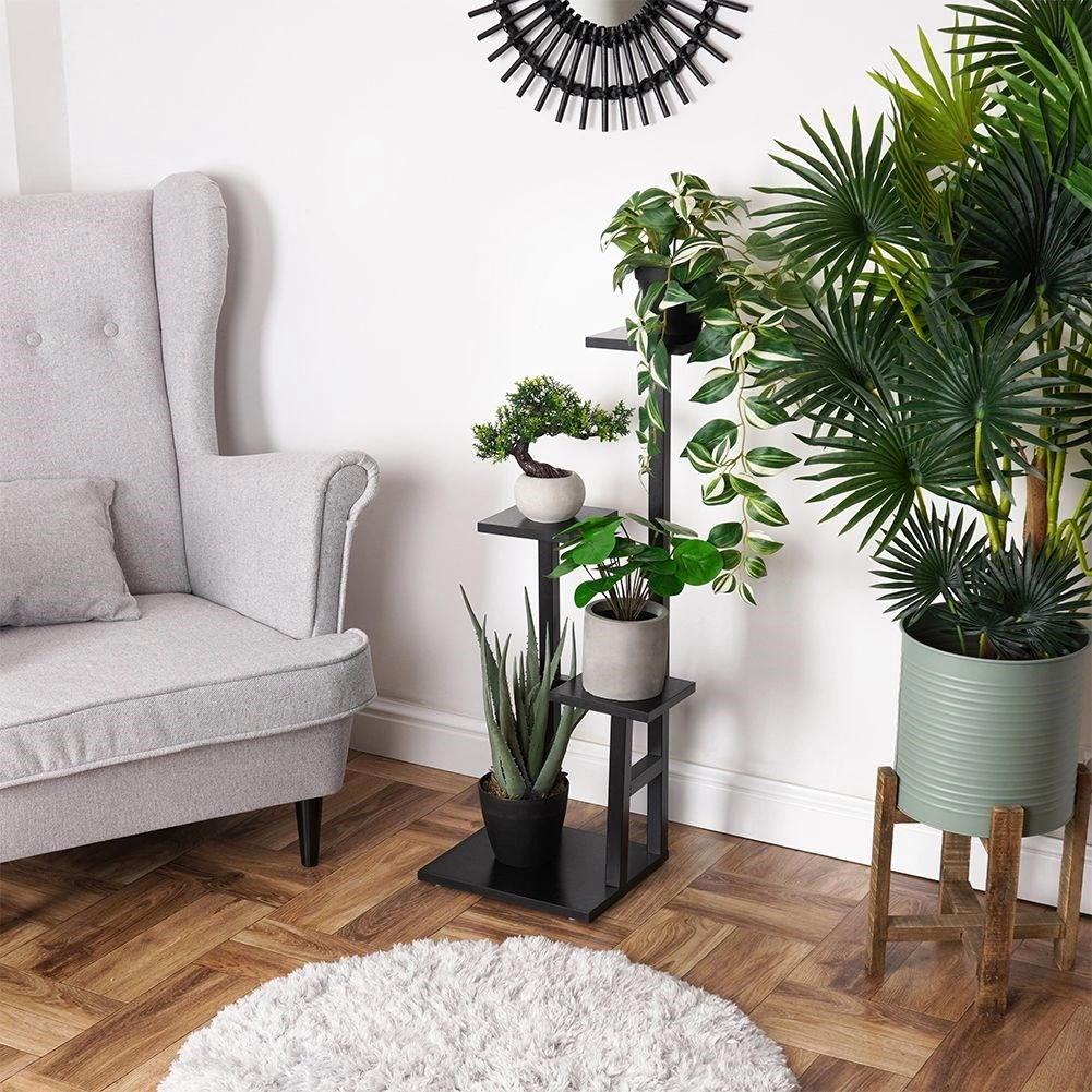 Elegancki czteropoziomowy stojak na kwiaty z kompaktową podstawą oszczędza miejsce i przejrzyście eksponuje Twoje rośliny oraz dekoracje. Ma wymiary 36,5 × 32 × 84 cm i udźwignie do 15 kg (maks. 5 kg na półkę). Połączenie wytrzymałego metalu i MDF z dekorem drewna w czarnym kolorze, stabilna konstrukcja oraz industrialny styl pasują do salonu, biura i na balkon.