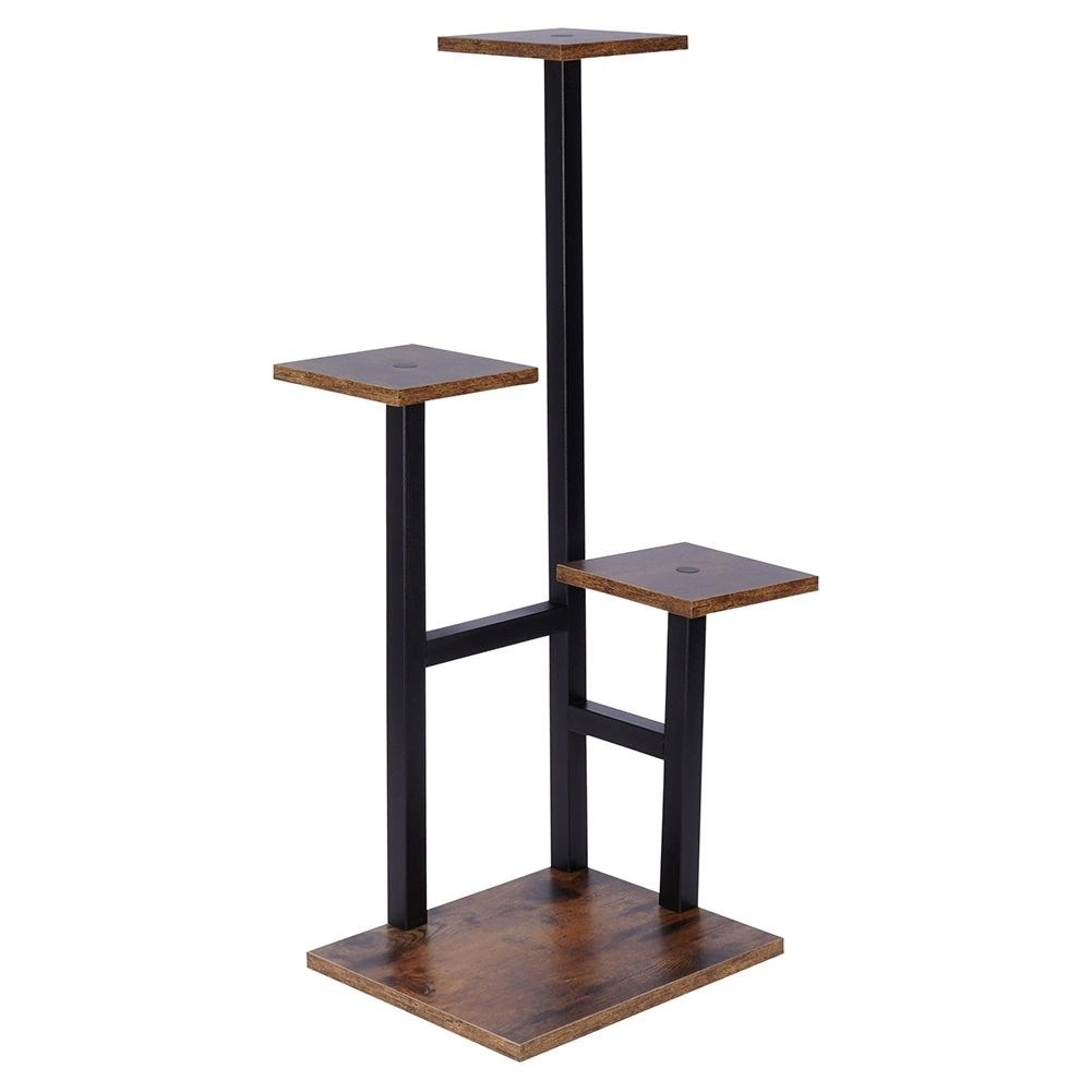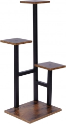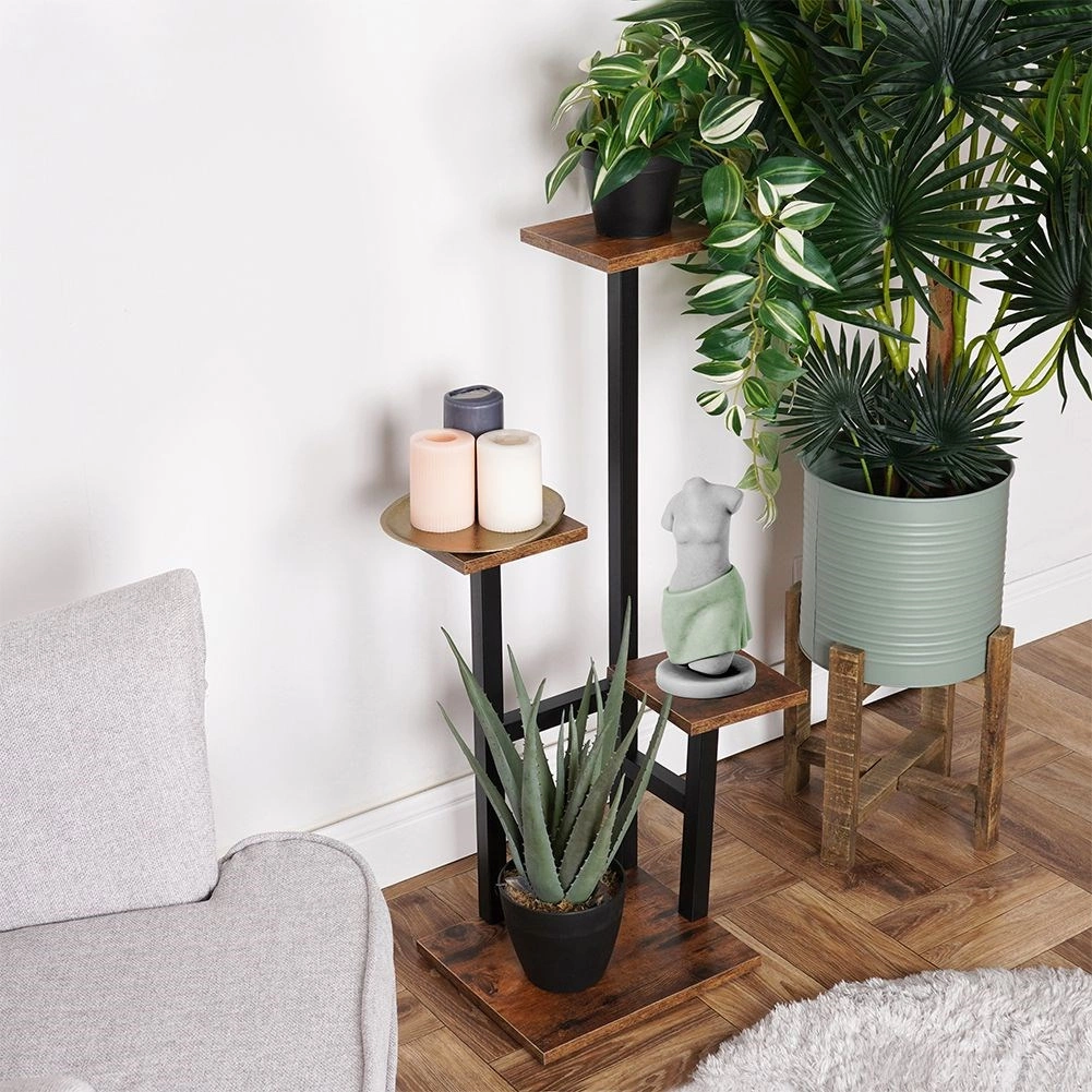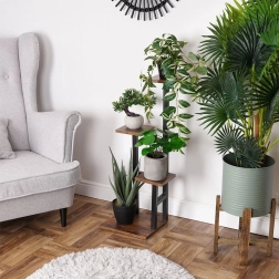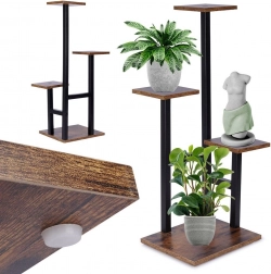 Ten wielopoziomowy stojak na kwiaty łączy czarną metalową konstrukcję z półkami MDF w dekorze ciemnego drewna. Jego stopniowany design pozwala efektownie wyeksponować więcej roślin na niewielkiej powierzchni i stworzyć atrakcyjną zieloną kompozycję w każdym wnętrzu.