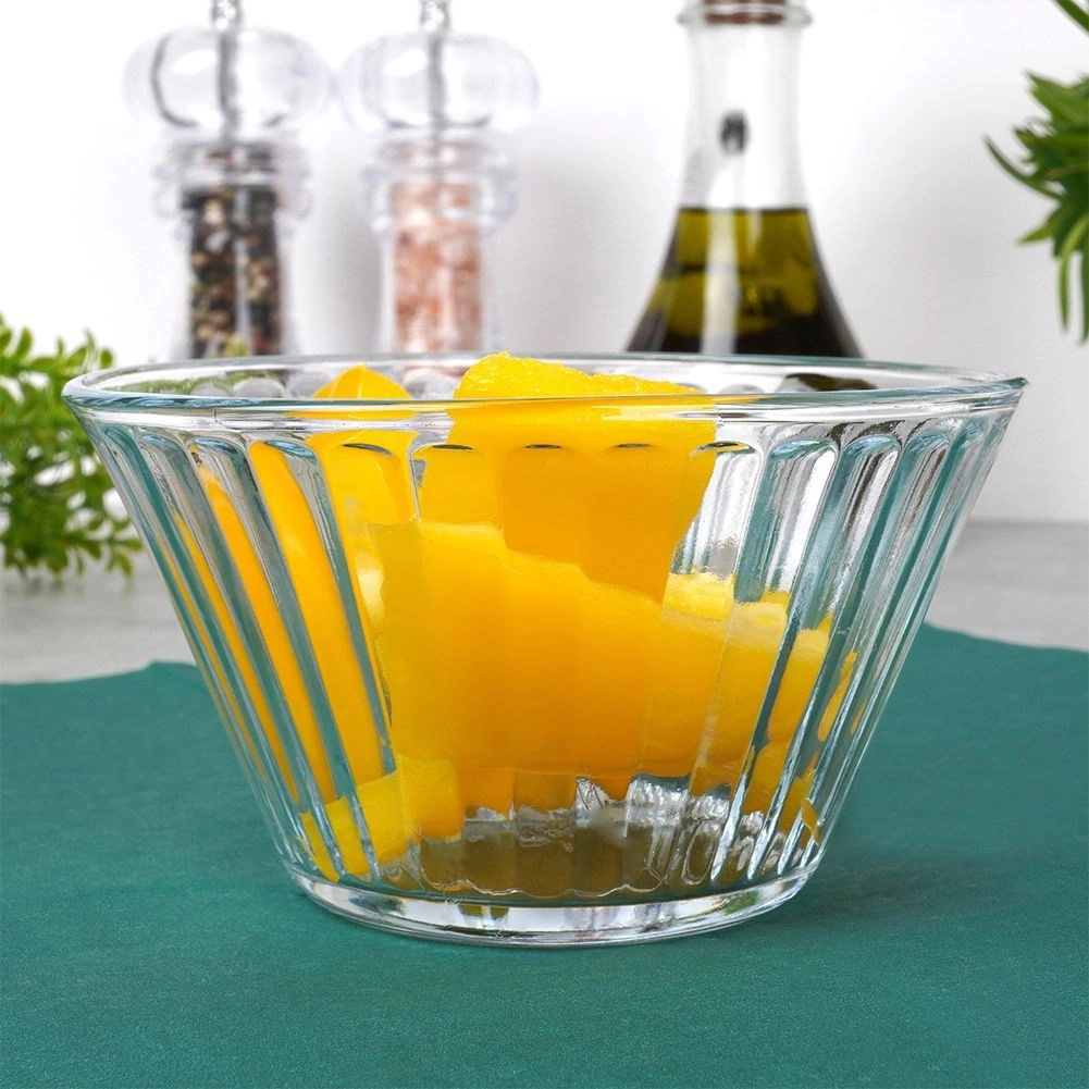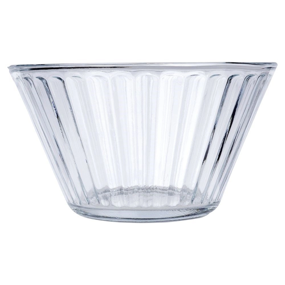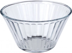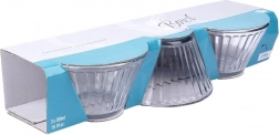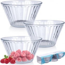 Praktyczny zestaw trzech szklanych misek o pojemności 270 ml z transparentnego szkła z eleganckim żłobkowaniem. Świetne do codziennego użytku i odświętnego serwowania. Wykorzystasz je na desery, sosy i dipy, sałatki oraz przekąski. Dzięki klasycznemu wzornictwu pasują do każdej kuchni i można je myć w zmywarce.