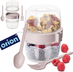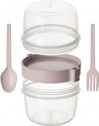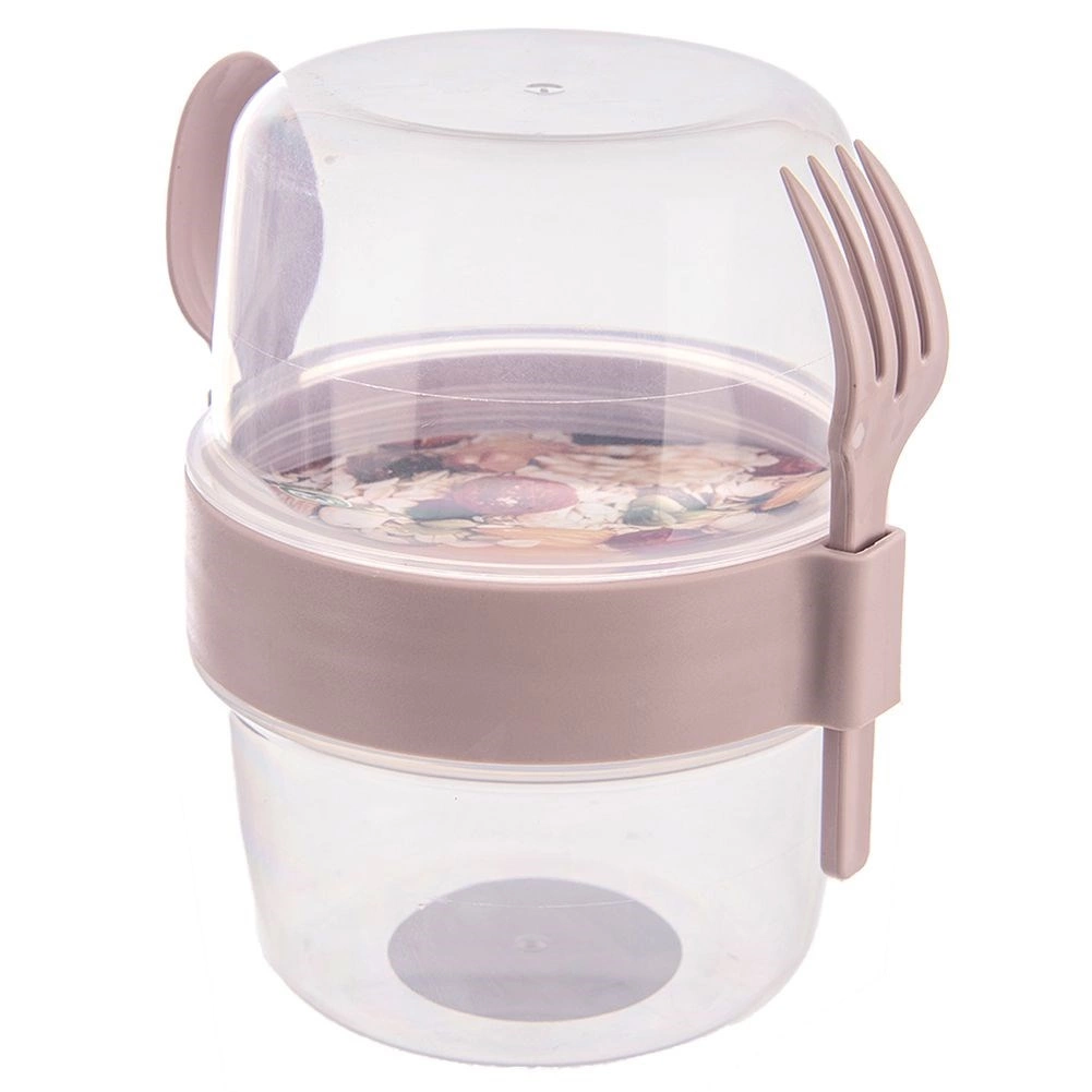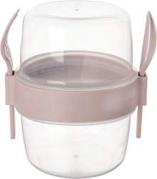 Praktyczny dwupoziomowy kubek na jogurt z miską na musli o pojemności 370 ml jest idealny w podróży, do pracy i do szkoły. Dzięki szczelnej pokrywce, oddzielnej komorze na dodatki oraz dołączonym łyżeczce i widelczykowi twoja przekąska będzie zawsze gotowa i świeża. Wykonany z trwałego plastiku bez BPA, odpowiedni do zmywarki, a bez pokrywki także do mikrofalówki.